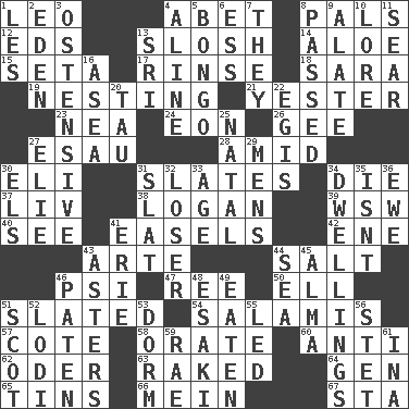 ACROSS 1. Lion 4. Collude with 8. Friends 12. Begley and Asner 13. Make a splashing sound 14. Medicinal plant 15. Stalk of a moss capsule 17. Wash lightly 18. "Two Mules for Sister ____" 19. Snuggling 21. Next before 23. Teachers' org. 24. A really long time 26. Turn to the right 27. Son of Isaac 28. Among 30. Connecticut Ivy Leaguer 31. Chalkboards 34. Expire 37. 54 in ancient Rome 38. Utah city north of Ogden 39. Compass dir. 40. Observe 41. Artist's stands 42. Compass dir. 43. Johnson of "Laugh-In" 44. Table seasoning 46. Air pressure measure (abbr.) 47. Portuguese money of account (variant) 50. Pipe bend 51. Scheduled 54. Deli grouping 57. ____ d'Azur (French Riviera) 58. Speak pompously 60. Opposed to 62. Baltic tributary 63. Swept the length of 64. Commissioned mil. rank 65. Canisters 66. Count _ (2 wds.) 67. R.R. building DOWN 1. French article 2. Genesis locale 3. Clearly or manifestly demonstrative 4. Place in a line 5. Beat drum 6. Double-curved letter 7. Those things 8. Went by 9. Having winglike extensions 10. Old wives' tales, e.g. 11. Scorch 13. _ Lanka 16. Toward the sea 20. The 19th letter of the Greek alphabet 22. Armor plate that protects the chest 25. Brizilian seaport 27. Writer Wiesel 29. Not women's 30. Raised railways 31. Narrow board 32. Failure 33. Personal question 34. Homes 35. Is not 36. She-sheep 41. 4th largest of the Great Lakes 43. Michaelmas daisies 44. Ocean 45. _ mater 46. Eucharist need 48. 1973 Nobel Price Winner (Physics) Leo 49. Ingested 51. Native of Scotland 52. Farming town in central California 53. Dormintory (informal) 55. Directed 56. Proofreading order 59. Actress Charlotte 61. _ tizzy (2 wds.)