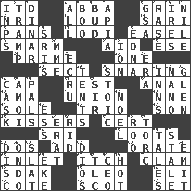 ACROSS 1. It would 4. Swedish rock group 8. Amused look 12. Medical imaging device (abbr.) 13. Central Nebraska county 14. Indian skirt 15. Zero-star reviews 17. Farming town in central California 18. Artist's stand 19. Excessive but superficial compliments 21. Assist 23. Compass dir. 24. First class 26. Single 28. Religious group 30. Catching in a trap 34. Head covering 37. Take ten 39. Of or related to the anus 40. Nursemaid (var.) 41. The state of being joined or united 43. Compass dir. 44. Not divided or shared with others 46. Musical group of three 47. Male offspring 48. Smoochers 51. Certainty 54. Indian title of respect (Mr.) 55. Plunders 58. Two (Sp.) 61. Say or write further 63. Speak pompously 65. An arm off of a larger body of water 67. Hankering 71. Burrowing marine mollusk 72. Neighbor of Neb. 73. Butter sub 74. Biblical high priest 75. ____ d'Azur (French Riviera) 76. Native of Scotland 77. Arrange properly for use DOWN 1. Naughty children 2. _____ steamer (cargo ship) 3. Middle Eastern gold or silver currency 4. 100% 5. Surprise greeting 6. Partially opened flower 7. Capital of Western Samoa 8. Girls' org. (abbr.) 9. Raze (variant) 10. Angers 11. The longest river in the world 16. Indian titles of respect 18. Pulitzer Prize-winning author Ferber 20. Madame (abbr.) 22. Electrically charged atom 25. Shade of tan 27. Period 29. Portable shelters 30. Unemotional 31. Lodging establishments 32. Billionth: prefix 33. Small, secluded valley 34. Keg 35. Mine, in Marseilles 36. Friends 38. Title for a knight 42. Christmas carol 45. Double-curved letter 49. Part of Q.E.F. 50. To free from 52. Friend of Pooh 53. Torque (variant) 56. Falsehoods 57. Having lost freshness 58. Plate 59. Southwest Nigerian state 60. Narrow board 62. "Vaya con ____" 64. Give off 66. Supplement with great effort 68. Affectionate concern, for short 69. Corporate head (abbr.) 70. Being at a high temperature