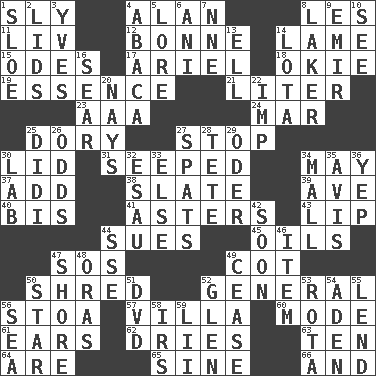 ACROSS 1. Mischievous 4. Actor Alda or Thicke 8. French article 11. 54 in ancient Rome 12. Child's nurse 14. Unable to walk 15. Lyric poems 17. Satellite of Uranus 18. Migrant worker of the '30s 19. Core 21. 61 cubic inches 23. American Automobile Association (abbr.) 24. Spoil 25. Rowboat 27. Close up, plug up 30. Hat (slang) 31. Oozed 34. Can I? 37. Increase 38. Chalkboard 39. "___ Maria" 40. Twice 41. Michaelmas daisies 43. Mouth edge 44. Takes to court 45. Petroleums 47. Mayday 49. Small bed 50. Fragment 52. Commissioned military rank 56. Portico 57. Country residence 60. Method 61. Hearing organs 62. Frees from moisture 63. Nine, plus one 64. "We ___ not amused" (Victoria) 65. Trig term 66. Also DOWN 1. A type of plum 2. Flaplike coverings 3. Jacques Cousteau's middle name 4. Phillipine bananalike plant 5. Old wives' tales, e.g. 6. Black tropical American cuckoo 7. Compass dir. 8. Member of a famous L.A. basketball team 9. Independent ruler or chieftain 10. Perceive with the eye 13. Pipe bend 14. Globular water bottle used in Asia 16. Singe 20. Negative votes 22. Naughty child 25. "You Light Up My Life" star Conn 26. Probability 27. Arguments over trivial matters 28. False hair 29. River in Europe 30. Experiment locale 32. Son of Isaac 33. Otherwise 34. Promenade 35. Deliberation 36. Slangy assent 42. Within a short period 44. Compass dir. 46. A whole individual unit 47. Dinah or Pauly 48. Mouths or openings 49. Desist 50. Play the lead 51. Movie disc 52. Small, secluded valley 53. Roll call or roster of names 54. An important port of Yemen 55. Grant temporary use of 56. Ocean 58. Big collection agency 59. Cards in a Roman deck?