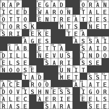 ACROSS 1. Reproach for some lapse or misdeed 4. Mild oath 8. NW Algerian seaport 12. On the rocks 14. Make _____ (do battle with) 16. Story 17. Von Bismarck 18. Pleas 20. Cod relative 22. Mountains (abbr.) 23. Fish or hair follower 24. Indian title of respect (Mr.) 25. Make supply last 28. Beverage made from leaves 30. Grows older 31. Slender Brazilian palm 35. Experiment locale 37. Singer James 40. Stated 41. Deli pickle 42. Mole, birthmark 44. _ china 45. Otherwise 46. Indian skirt 47. Compass dir. 48. Trap for birds or small mammals 50. A single undivided whole 52. Small boy 54. Was introduced to 55. Fast jet (abbr.) 58. Adept person 61. Friend of Pooh 63. Having winglike extensions 65. Innocence, gentleness, or tenderness 70. Russian composer Stravinsky 71. Actor Baldwin 72. Nest on high 73. Snakelike fish 74. To erase 75. "Two Mules for Sister ____" 76. Perceive with the eye DOWN 1. Disturbances 2. Thespian 3. _ dish (used to culture cells) 4. She-sheep 5. Separate the seeds from cotton 6. Nonscientific branch of learning 7. Dormintory (informal) 8. Baseball player Mel 9. Precipitation 10. Toward shelter 11. Egg locale 13. Two (Sp.) 15. Remaining after all deductions 19. Toward the sea 21. Barrel 26. Peachy ____! 27. _____ Park, CO 29. Aid 30. Most capable 32. Without 33. Assistant 34. Wedding promise 35. _ and Stitch 36. In addition 38. Federal power corp. 39. Gold (Symbol: Au) 41. Lair 43. Trig term 49. Hearing organs 51. Call ___ day 53. Capital of the state of Qatar 55. Gurus 56. Took without asking 57. Laconic 58. The sixth month of the Jewish calendar 59. Root beer relative 60. Nights before holidays 62. Washington bills 64. Whopper 66. Frozen water 67. Period 68. Title for a knight 69. Ocean
