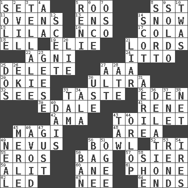 ACROSS 1. Stalk of a moss capsule 5. Friend of Pooh 8. Fast jet (abbr.) 11. Baking chambers 13. Followers of ems 14. Overwhelm 15. Pale purple color 16. Non-commissioned officer (abbr.) 17. Root beer relative 18. Pipe bend 19. Writer Wiesel 21. Domineers 22. Hindu god of fire 24. "Tell ____ the Marines!" 25. Erase 27. Auto club (abbr.) 29. Migrant worker of the '30s 30. Extremist 32. Observes 33. Clothes sense 35. Paradise 39. Peak District village in England 41. French philosopher Descartes 42. Housemaid (var.) 43. Bathroom plumbing fixture 45. Wise men 48. Length times width 49. Congenital growth or mark on the skin 50. Soup holder 52. Three (prefix) 55. Greek god of love 56. Container for groceries 57. Flexible twig of a willow tree 59. Came down and settled, as after flight 60. A saturated hydrocarbon 61. Give a jingle 62. Directed 63. Born 64. Extremities DOWN 1. Not divided or shared with others 2. Tending to cause great harm 3. Copy Pinocchio 4. Santa ___, CA 5. Painter Guido (1575-1642) 6. Single time 7. Bear (Spanish) 8. Derisive sound 9. Twentieth part of a lira 10. It was, poetically 12. Odor 14. Highlander 20. Falsehood 21. One who doesn't tell the truth 23. Honkers 25. Two (Sp.) 26. Supplement with great effort 27. Keyboard modifier key 28. Had dinner 30. Purpose 31. Nest on high 33. Scottish cap 34. Insect wing 36. Accusation by an informer 37. Compass dir. 38. Fish or hair follower 40. Raised platform 43. The 23rd letter of the Hebrew alphabet 44. Fourth or lowest deck 45. Haggard of country music 46. Shun 47. Abrupt rush of wind 49. Actress Patricia 50. Object of repulsion 51. Double curve, resembling the letter S 53. Tear apart 54. Angers 56. Prohibit 58. A female animal or person