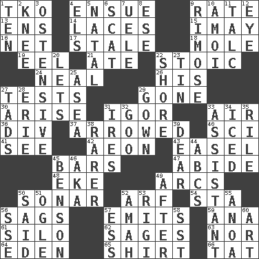 ACROSS 1. Ring climax 4. Take place subsequently 9. Assign a rank or rating to 13. Followers of ems 14. Shoestrings 15. "If ____ say so..." 16. Fish or hair follower 17. Showing deterioration from age 18. Undercover agent 19. Snakelike fish 21. Had dinner 22. Unemotional 24. Anneal 26. Part of HMS, perhaps 27. Trials 29. Went 30. Get up 31. Composer Stravinsky 33. Wind 36. HTML Container Element 37. Moved like an arrow 40. _-fi 41. Observe 42. Age 43. Artist's stand 45. Soap units 47. Remain 48. Make supply last 49. Curves 50. Underwater navigation system 52. Sandy's bark 54. R.R. building 56. Settles 57. Gives off 59. Santa ___, CA 61. Grain storage tower 62. Gurus 63. And not 64. Locale of original sin 65. Chest covering 66. Make lace DOWN 1. "___ Little Indians" 2. Leg joint 3. Clearly or manifestly demonstrative 4. Raised railways 5. Relating to or accompanying birth 6. Scram! 7. Ubangi River tributary 8. Compass dir. 9. Full of chinks, cracks, or crevices 10. Mine, in Marseilles 11. Baby powder 12. Sight organ 20. Allows 22. Dinah or Pauly 23. Metal container 25. At sea 27. Small amounts or degrees 28. 4th largest of the Great Lakes 29. Bride's dress 31. Angers 32. Thick or sticky substance 33. Helper 34. On the rocks 35. Cause heat under the collar 38. More valued for its uncommonness 39. Letter starter 44. Lettered men learn these first 45. Gillaume's butler role 46. Alias (abbr.) 49. Following 50. Alleged 51. Stare at amorously 52. Wet nurse 53. Swiss mountan, "Queen of the Mountains" 55. Small Philippine buffalo 56. Compass dir. 57. Curvy letter 58. Fast jet (abbr.) 60. Nonscientific branch of learning