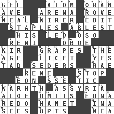 ACROSS 1. Set 4. Tiny particle 8. NW Algerian seaport 12. "___ Maria" 13. Sports stadium 14. Be footloose 15. Actress Patricia 17. One who wires 18. Prepare for publication 19. Paper fasteners 21. Most capable 23. Part of HMS, perhaps 24. Directed 26. Bear (Spanish) 27. Painter Guido (1575-1642) 28. Mitch Miller's instrument 30. Apertif with cassis 31. Wine fruits 34. Definite Article 37. Ripen 38. It is permitted: Lat. 39. Affirmative reply 40. Bit 41. Spring feasts 42. Actress Charlotte 43. French philosopher Descartes 44. Cease 46. Period of immesurable duration 47. Compass dir. 50. Nervous spasm 51. Heat 54. Nineveh was its capital 57. _ vera 58. Leaves out 60. Pulitzer Prize-winning author Ferber 62. Do over again 63. French painter Edouard 64. _ tizzy (2 wds.) 65. Observes 66. Chooses 67. Teachers' org. DOWN 1. Separate the seeds from cotton 2. Nights before holidays 3. Tough but pliablecoriaceous 4. Satellite of Uranus 5. Laconic 6. Single 7. Hindu Mythology: god of death 8. Threatening words 9. Cowboy competition 10. Deliberation 11. Remaining after all deductions 13. Leather borer 16. (Had) reclined 20. 23rd letter of the Greek alphabet 22. Scornful sounds 25. Drug addict 27. Port city in Latvia 29. Stakes 30. Krazy ___ of comics 31. Small, secluded valley 32. Amusement-park features 33. Adept person 34. Polypeptide antibiotic 35. Pile 36. Compass dir. 41. Transmitted 43. Lover boys 44. Filthy place 45. Hoop that covers a wheel 46. Wear away 48. Virtuous person 49. _____ Park, CO 51. Armed conflicts 52. Toward shelter 53. Like (prefix) 55. Fast jet (abbr.) 56. Queen of England 1702-14 59. Atlas unit 61. American Automobile Association (abbr.)