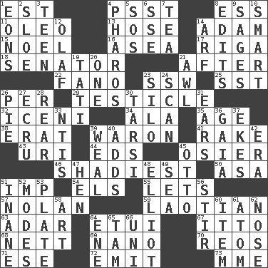 ACROSS 1. Eastern Standard Time (abbr.) 4. Inconspicuous attention getter 8. Curvy letter 11. Butter sub 13. Flexible conduit 14. First of billions? 15. Christmas carol 16. At sea 17. Capital of Latvia 18. Legislator 21. Following 22. Papal veil 23. Compass dir. 25. Fast jet (abbr.) 26. For each 29. A testis 32. Ancient Celtic tribe of eastern Britain 34. According to 35. Grow older 38. Part of Q.E.F. 39. Make _____ (do battle with) 41. Immoral or dissolute person 43. RI univ. 44. Begley and Asner 45. Flexible twig of a willow tree 46. Most questionable 50. White ___ sheet 51. Naughty child 54. Raised railways 55. Allows 57. Pitcher Ryan 59. Of or relating to Laos or its people 63. The sixth month of the Jewish calendar 64. Needle case 67. "Tell ____ the Marines!" 68. Remaining after all deductions 69. Billionth: prefix 70. Vintage cars 71. Compass dir. 72. Give off 73. Madame (abbr.) DOWN 1. Immeasurably long periods of time 2. A type of plum 3. Adolescent 4. N Egypt peninsula 5. Mayday 6. Compass dir. 7. Beverage made from leaves 8. Prepares for publication 9. Gurus 10. Don Adams' spy role 12. Norwegian king 14. Sandy's bark 19. Jacques of French films 20. Single 21. Leather borer 23. Grain storage tower 24. Glance over 26. Sliced dessert 27. Shade of tan 28. Buttocks 30. Tarsus (plural) 31. Hearing organs 33. Nuclear Threat Initiatives 36. Greek goddess of the earth (variant) 37. Supplements with great effort 39. Welt 40. Sums up 42. Epoch 45. Von Bismarck 47. Layer 48. American author Paul (1891-1958) 49. Ocean 51. Empty; void 52. Methods 53. Food holder 56. Commotion 58. Nonscientific branch of learning 60. A whole individual unit 61. Tiny particle 62. Sense of smell 64. Compass dir. 65. Scottish cap 66. Corn or form start