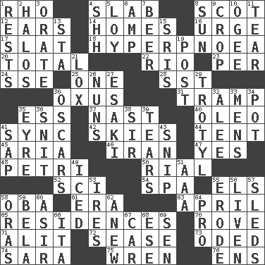 ACROSS 1. 17th letter of the Greek alphabet 4. Broad, flat, thick piece 8. Highlander 12. Hearing organs 14. Residences 16. Goad 17. Narrow board 18. Abnormally rapid or deep breathing 20. "_____ Recall" 22. River (Sp.) 23. For each 24. Compass dir. 25. Single 28. Fast jet (abbr.) 30. Amu Darya 31. _____ steamer (cargo ship) 35. Double-curved letter 37. Political cartoonist Thomas 40. Margarine 41. Synchronize (abbr.) 42. Atmospheres 44. Portable shelter 45. Operatic vocal solo 46. SW Asia republic 47. It is so 48. _ dish (used to culture cells) 50. Monetary unit of Yemen 52. _-fi 54. Health resort 55. Raised railways 58. Chief or king in Benin or Nigeria 61. Epoch 63. Showery time 65. Dwellings 70. Be footloose 71. Came down and settled, as after flight 72. Gospel singer Marvin 73. Wrote a lyric poem 74. "Two Mules for Sister ____" 75. Songbird 76. Followers of ems DOWN 1. Musical pauses 2. Radiant circles of light 3. Declaim 4. Quiet! 5. Myrna of the movies 6. Electrical Unit 7. Fermented drink made from hops 8. Player for Phoenix 9. Riding implement 10. Double curve, resembling the letter S 11. Separate forcefully 13. R.R. building 15. Indian titles of respect 19. Mail 21. Brine-cured salmon 26. Religious women 27. 1973 Nobel Price Winner (Physics) Leo 29. TNT 30. Motion picture awards 32. Toward shelter 33. Not women's 34. Plant holder 35. Jane of fiction 36. In a ____ (agitated or irritated) 38. Title for a knight 39. Pulls apart 41. Plant excrement 43. Clip 49. On the rocks 51. American Automobile Association (abbr.) 53. Angers 55. Wear away 56. Make or become more lively 57. Bobsleighs 58. Mouths or openings 59. Actor Lugosi 60. SW Saudi Arabia district 62. Afresh 64. Adept person 66. Call ___ day 67. Auto 68. Compass dir. 69. Elected rep.