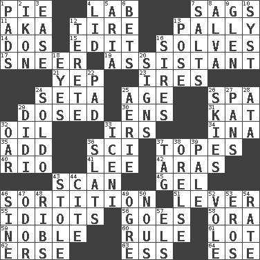 ACROSS 1. Sliced dessert 4. Experiment locale 7. Sinks 11. Alias (abbr.) 12. Hoop that covers a wheel 13. Chummy 14. Two (Sp.) 15. Prepare for publication 16. Finds the solution 17. Contemptuous expression 19. Helper 21. Slangy assent 23. Angers 24. Stalk of a moss capsule 25. Mature 26. Health resort 29. Administered medicine 30. Followers of ems 31. Krazy ___ of comics 32. Petroleum 33. Big collection agency 34. _ tizzy (2 wds.) 35. Say or write further 36. _-fi 37. Drinks excessively 40. _ de Janeiro 41. Area sheltered from the wind 42. Ancient river in northeast Turkey 43. Examine minutely or intensely 45. Set 46. Decision 51. Prying instrument 55. Foolish or stupid persons 56. Moves 58. Mouth or opening 59. Having high moral qualities 60. Court order 61. Car dealer's back yard 62. Celtic language 63. Curvy letter 64. Compass dir. DOWN 1. Groovy apts. 2. Picture 3. Comfort 4. Hat (slang) 5. Roberta Peters solo 6. Stakes 7. Table seasonings 8. Inventor's middle name 9. Small, secluded valley 10. System (abbr.) 12. Cylindrical with tapered ends 13. Airs 16. Male parents of animals 18. Sight organs 20. Public displays of written messages 22. Writing tablet 24. Twentieth part of a lira 25. Nest on high 26. Atmospheres 27. Baking dishes 28. _ moment's notice (2 wds.) 29. "You Light Up My Life" star Conn 32. Rowing implement 33. Ancient Celtic tribe of eastern Britain 36. Narrow boards 37. Label 38. Threatening words 39. Diluted with white 43. Fur scarf 44. Quote 46. Trig term 47. Aroma 48. Chest bones 49. Legendary monster 50. Good sense 52. Short-tailed, large-bodied rat 53. Greek god of love 54. Pace 57. Raised railways