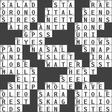 ACROSS 1. Vegetable dish 6. R.R. building 9. Actress Charlotte 12. U. of Maine site 13. Slanted text style (abbr.) 14. Post 15. Fathers 16. Remaining after all deductions 17. Religious women 18. Wind 19. Against 20. Went 21. Global Positioning Systems (abbr.) 23. RI univ. 24. Sight organs 25. Catcalls? 28. Writing tablet 30. Relating to the nose 34. Fastener 35. Cuckoo 36. Small island 38. Lyricist Gershwin 39. Ear part 41. Wetness 43. Fast jet (abbr.) 44. Shopping centers 46. Behest 48. Connecticut Ivy Leaguer 49. Sew up the eyelids of hawks and falcons 50. Clip 51. Undercover agent 53. "___ Maria" 56. Margarine 57. "Two Mules for Sister ____" 58. Took without asking 60. State of inaction 61. Heroin 62. Sun: prefix 63. Music discs 64. Car or cant ending 65. _____ Park, CO DOWN 1. Distress signal 2. Operatic vocal solo 3. Australian parrot (variant) 4. Disorder of the immune system 5. Two (Sp.) 6. Proofreading order 7. Jacques of French films 8. The first octave above the treble staff 9. One who advocates reunion 10. Queen of England 1702-14 11. Begley and Asner 13. Taverns 14. Sounds asleep 19. Slender Brazilian palm 20. Chewing product 22. Writing instrument 24. The property of being fit to eat 26. Armed conflicts 27. Argument over a trivial matter 28. Inside of hand 29. Small Philippine buffalo 31. Compass dir. 32. Wing 33. Allow 37. Giggle 40. American author Paul (1891-1958) 42. To separate or throw off 45. Small drink 47. Chalkboards 49. Volcanic refuse 50. Downhill vehicle 51. Create 52. NW Algerian seaport 54. Electrical Unit 55. Writer Wiesel 56. The grampus (Milton) 57. Compass dir. 58. A female animal or person 59. Greek goddess of the dawn