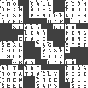 ACROSS 1. From 4. Give a ring to 8. The Jewish people; Israel 12. 480, 500 or 516 sheets of paper 14. Type of rug 15. Southwest Nigerian state 16. Otherwise 17. Homes 20. Colored 21. Obsolete 22. Binary compound 23. Actors Connery and Penn 27. Necklace unit 29. Letter starter 31. Not women's 34. Peak District village in England 35. Queen of England 1702-14 36. Lick closed 39. Label 41. Proofreading order 42. Lacking warmth 43. Flower holders 46. Capri or Wight 47. Singer James 48. Mouths or openings 51. Having ears or earlike features 54. Keyboard modifier key 56. Mamie's husband 58. Greek god of love 61. Happening in regular succession 66. Swiss mountan, "Queen of the Mountains" 67. Group working together 68. 4th largest of the Great Lakes 69. Shout 70. Sew up the eyelids of hawks and falcons 71. Plant excrements 72. Observe DOWN 1. Flintstone 2. Have trust in 3. Fertile tracts in a desert 4. Automobile 5. "We ___ not amused" (Victoria) 6. French article 7. Put down 8. Male offspring 9. Happening 10. Wrote a lyric poem 11. Olfactory organ 13. Ancient Persian 18. Apply (a substance) by light strokes 19. She-sheep 24. Find the sum of 25. Teachers' org. 26. Table seasoning 28. Collect or gather 30. Rob, plunder, or pillage 32. Compass dir. 33. Arrange properly for use 34. A person who is older than you are 36. _-fi 37. Greek goddess of the dawn 38. One to whom something is allotted 40. Yard entry 44. R.R. building 45. Ewer handle 49. Small island 50. What Jean-Claude Killy likes to do 52. Suggestive of the supernatural 53. Frees from moisture 54. Curves 55. Old wives' tales, e.g. 57. Nights before holidays 59. Stare 60. Drop; flow; fall 62. Leather borer 63. Period 64. Mouth edge 65. It is so