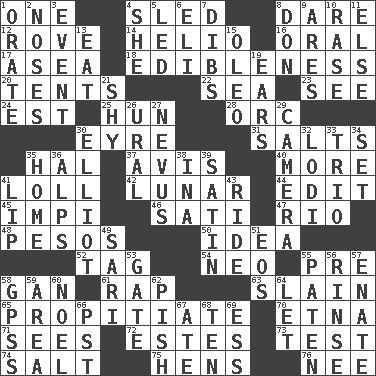 ACROSS 1. Single 4. Downhill vehicle 8. Have the gumption 12. Be footloose 14. Sun: prefix 16. Taken by mouth 17. Toward the sea 18. The property of being fit to eat 20. Portable shelters 22. Ocean 23. Observe 24. Eastern Standard Time (abbr.) 25. Attila the _ 28. The grampus (Milton) 30. Jane of fiction 31. Table seasonings 35. Actor Linden 37. Deliberation 40. Greater amount 41. Hang loosely or laxly 42. Type of eclipse 44. Prepare for publication 45. Body of Kaffir warriors 46. Suttee (variant) 47. River (Sp.) 48. Mexican monetary units 50. The main thing one is thinking about 52. Label 54. Modern: prefix 55. Before (prefix) 58. Separate the seeds from cotton 61. Reproach for some lapse or misdeed 63. Killed 65. Conciliate 70. Inactive volcano in Sicily 71. Perceives with the eye 72. _____ Park, CO 73. Trial 74. Table seasoning 75. Coop moms 76. Born DOWN 1. Speak pompously 2. Olfactory organs 3. Incident 4. A female animal or person 5. Directed 6. Biblical high priest 7. Claim 8. Spanish title 9. Ancient Greek god of war 10. Raze (variant) 11. Otherwise 13. Erode 15. Butter sub 19. Hearing organs 21. Like a shrinking violet 26. Mountain range 27. Mole, birthmark 29. Device for capturing images 30. American author Paul (1891-1958) 32. Farming town in central California 33. Musical group of three 34. Put into a specified state 35. Residence 36. High mountains 38. _ tizzy (2 wds.) 39. Smooth fabric 41. Mouth edge 43. Travel on an animal 49. Indian skirt 51. Greek goddess of the dawn 53. Yard entry 55. Eucharist need 56. Remove soap 57. Related on the mother's side 58. Global Positioning Systems (abbr.) 59. Type of rug 60. Christmas carol 62. Expression of disdain 64. Allow 66. Pacific Standard Time (abbr.) 67. Had dinner 68. Nine, plus one 69. Double-curved letter