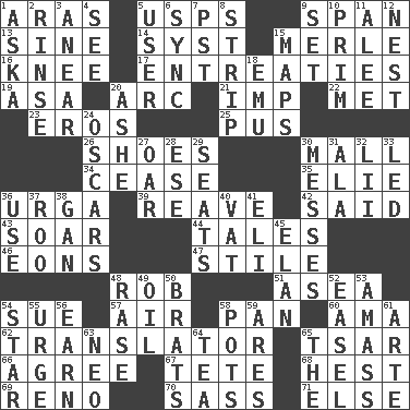 ACROSS 1. Caspian sea tributary 5. United States Postal Service (abbr.) 9. Connect, as a bridge 13. Trig term 14. System (abbr.) 15. Haggard of country music 16. Leg joint 17. Pleas 19. White ___ sheet 20. Curve 21. Naughty child 22. Was introduced to 23. Greek god of love 25. Tenth month of the Hindu calendar 26. Imelda's hoard 30. Shopping center 34. Stop 35. Writer Wiesel 36. Capital and largest city of Mongolia 39. Rob, plunder, or pillage 42. Expressed in words 43. Fly high 44. Lies 46. Immeasurably long periods of time 47. Vertical member of a panel or frame 48. Director Reiner 51. At sea 54. Institute legal proceedings 57. Atmosphere 58. Baking dish 60. Nursemaid (var.) 62. Interpreter 65. Russian ruler of old 66. Match 67. False hair 68. Command 69. Former U.S. Attorney General Janet 70. Backtalk 71. Otherwise DOWN 1. "____ silly question..." 2. Wash lightly 3. Approach 4. Observe 5. One who uses or employs something 6. Synchronize (abbr.) 7. Pacific Standard Time (abbr.) 8. Empty completely 9. Arrange properly for use 10. Demure 11. Toward shelter 12. Egg locale 15. Atlas contents 18. Australian flightless bird 20. American tennis player Robert 24. Motion picture awards 27. Boat paddle 28. Compass dir. 29. Theater features 30. Makes clutter 31. According to 32. Cards in a Roman deck? 33. Directed 36. Purpose 37. Friend of Pooh 38. Separate the seeds from cotton 40. Large container 41. Connecticut Ivy Leaguer 45. Style 48. To erase 49. Petroleum 50. Naughty children 52. Artist's stand 53. Collect or gather 54. Play the lead 55. Goad 56. Merit 58. Cooking vessels 59. Ancient Greek god of war 61. Johnson of "Laugh-In" 63. Modern: prefix 64. Beverage made from leaves 65. Definite Article