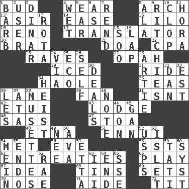 ACROSS 1. Partially opened flower 4. Put on (as clothing) 8. Bowlike part 12. SW Saudi Arabia district 14. Comfort 15. _ and Stitch 16. Former U.S. Attorney General Janet 17. Interpreter 20. Naughty child 21. ___ good deed 22. Numbers guy (abbr.) 23. All-night dance parties 27. Brightly colored fish 29. On the rocks 31. Travel on or in a vehicle 34. White Person, in Hawaii 35. Afternoon social gatherings 36. Unable to walk 39. Avid follower 41. Is not 42. Needle holder 43. Inn 46. Backtalk 47. Portico 48. Inactive volcano in Sicily 51. World-weariness 54. Was introduced to 56. First lady 58. Fast planes 61. Pleas 66. Shaw product 67. It may be bright or harebrained 68. Airtight sealed metal containers 69. Arranges properly for use 70. Sense of smell 71. Helper 72. Teat (slang) DOWN 1. Sharp remark 2. One who uses or employs something 3. Middle Eastern gold or silver currency 4. Dripping 5. Ewer handle 6. White ___ sheet 7. Tear apart 8. Wing 9. Actors Guy, Robert Welles, and Clint 10. Hoof sound 11. Israeli folk dance 13. Round or rotation of duties 18. "Barney Miller" actor Jack 19. Pet locale 24. By way of 25. Environmental prefix 26. Itself 28. Nick name for Arthur 30. Allots cards 32. One of the 12 tribes of Israel 33. Eastern Standard Time (abbr.) 34. Robbery 36. French article 37. _ moment's notice (2 wds.) 38. French bagpipes 40. Make mention of 44. Spanish title 45. Separate the seeds from cotton 49. Born 50. Actress Gardner 52. United States Postal Service (abbr.) 53. Small island 54. Chow _ 55. Inside; within (prefix) 57. Singer James 59. Jacques of French films 60. System (abbr.) 62. Actress Charlotte 63. One more than two 64. Conclude 65. Compass dir.