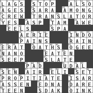 ACROSS 1. Falls behind 5. Halt 9. In addition 13. Ripens 14. "Two Mules for Sister ____" 15. Amid 16. Ship's personnel 17. Interpreter 19. It is so 20. Cleo's killer 21. Scottish cap 22. Deep reverence 23. Snakelike fish 25. Health resort 26. Nest on high 30. _ china 34. Aches 35. Precipitation 36. Part of Q.E.F. 39. Curses 42. Double curve, resembling the letter S 43. Billionth: prefix 44. Eroded 46. Ooze 47. Chalkboard 48. Groovy apt. 51. Allodial 54. Elected rep. 57. Wind 58. Biblical high priest 60. Arrange properly for use 62. Conciliate 65. Austrian river, tributary to the Danube 66. NE Netherlands city 67. Pulitzer Prize-winning author Ferber 68. Have the gumption 69. Adolescent 70. Neighbor of Neb. 71. Pig sound DOWN 1. Made of lace 2. Match 3. Honkers 4. Compass dir. 5. Fast planes 6. Canvas cover 7. Mouth or opening 8. Leg coverings 9. Wet nurse (var.) 10. Globular water bottle used in Asia 11. Frozen precipitation 12. Legendary monster 15. _ mater 18. Plant excrement 20. At sea 24. Portable computer 27. River (Sp.) 28. _ tizzy (2 wds.) 29. _____ Park, CO 30. Pressed 31. Tired old horse 32. Pass on 33. Single 36. Followers of ems 37. Actress Charlotte 38. A saturated hydrocarbon 40. Actor Linden 41. R.R. building 45. Needle case 48. Ache 49. Small island 50. Frees from moisture 52. Slender Brazilian palm 53. Acquire or gain knowledge or skills 54. Petty quarrel 55. Celtic language 56. Characteristic smell of wine 58. Inactive volcano in Sicily 59. Path through which fluid escapes 61. Long journey 63. Fenced enclosure 64. Find the sum of 65. Wedding promise