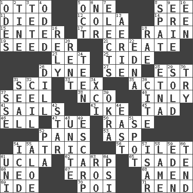 ACROSS 1. "Beetle Bailey" pooch 5. Single 8. Observe 11. Passed on 12. Root beer relative 14. Before (prefix) 15. Keyboard key 17. Relationship diagram 18. Water falling in drops from the sky 19. Sowing specialist 21. Cause to be 23. Allow 25. Event that recurs at intervals 26. Centimeter-gram-second unit of force 27. Elected rep. 28. Eastern Standard Time (abbr.) 31. _-fi 33. John Ritter's dad 35. Thespian 37. Sew up the eyelids of hawks and falcons 38. Non-commissioned officer (abbr.) 40. Inwardly 41. Moves on water 43. Mamie's mate 45. Bit 46. Pipe bend 47. Third day of the wk. 50. Raze (variant) 52. Baking dishes 53. Cleo's killer 54. Of or pertaining to medicine 56. Bathroom 61. Southern CA. univ. 62. Canvas cover 65. Sadhe (variant) 66. Modern: prefix 67. Greek god of love 68. So be it 69. Binary compound 70. Luau course 71. Tear apart DOWN 1. Lyric poems 2. Prong on a fork 3. False hair 4. Wrote a lyric poem 5. Sep. follower 6. Or not 7. Opts 8. Argument over a trivial matter 9. 4th largest of the Great Lakes 10. Car or cant ending 13. Nest on high 16. Have confidence or faith in 18. Actress Charlotte 20. Monthly bill 22. Pulitzer Prize-winning author Ferber 24. Adolescent 26. Deli pickle 28. Inactive volcano in Sicily 29. Disposed of to a purchaser 30. Attempt to accomplish something 31. Lick closed 32. To provide with a ceiling 34. One more than ninety 36. Quote 37. Compass dir. 39. Gumbo ingredient 42. Play the lead 44. 90 degrees 48. Join together 49. Fortification 51. Blemish 52. Parent Teacher Assoc. 54. On the rocks 55. _ vera 57. Austrian river, tributary to the Danube 58. Unable to walk 59. Genesis locale 60. Look after 61. University (slang) 63. Friend of Pooh 64. Air pressure measure (abbr.)