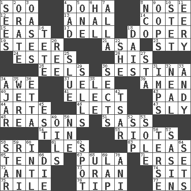 ACROSS 1. "Barney Miller" actor Jack 4. Capital of the state of Qatar 8. Characteristic smell of wine 12. Epoch 13. Of or related to the anus 14. ____ d'Azur (French Riviera) 15. 90 degrees 17. Small valley 18. Drug addict 19. Navigate 21. White ___ sheet 23. Filthy place 24. _____ Park, CO 26. Part of HMS, perhaps 28. Snakelike fish 30. French poetic form 34. Deep reverence 37. Ubangi River tributary 39. So be it 40. Passenger plane 41. Choose 43. Groovy apt. 44. Johnson of "Laugh-In" 46. Allows 47. Mischievous 48. Thinks logically 51. Backtalk 54. Shallow baking pan 55. Debaucheries 58. _ Lanka 61. French article 63. Entreaties 65. Is inclined (to) 67. Monetary unit of Botswana 71. Celtic language 72. Opposed to 73. NW Algerian seaport 74. Be seated 75. Cause heat under the collar 76. Native american tent (variation) 77. Followers of ems DOWN 1. Perceives with the eye 2. Speak pompously 3. Fertile tracts in a desert 4. June honoree 5. Single 6. Actor Linden 7. Silent film actress Nazimova 8. Non-commissioned officer (abbr.) 9. I made a mistake 10. Proofreading order 11. Suggestive of the supernatural 16. Wig 18. Raised platform 20. To separate or throw off 22. A female animal or person 25. Turn sharply 27. R.R. building 29. Exchanges for money 30. Religious groups 31. Naughty children 32. Anneal 33. "60 Minutes" Commentator Rooney 34. Partly open 35. Past tense of be (plural) 36. Singer James 38. Area sheltered from the wind 42. Russian ruler of old 45. Eastern Standard Time (abbr.) 49. Petroleums 50. Compass dir. 52. Small drink 53. Not divided or shared with others 56. Laconic 57. Indian antelope 58. Play the lead 59. Painter Guido (1575-1642) 60. International (abbr.) 62. Specific locale 64. Puts into a specified state 66. Pass on 68. RI univ. 69. Infant locale 70. Black tropical American cuckoo