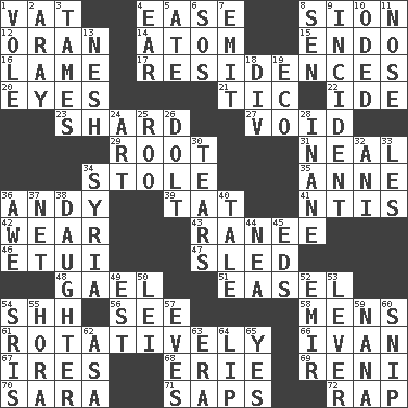 ACROSS 1. Large container 4. Relaxation 8. The Jewish people; Israel 12. NW Algerian seaport 14. Tiny particle 15. Inside; within (prefix) 16. Unable to walk 17. Dwellings 20. Snake ____ (dice throw) 21. Nervous spasm 22. Binary compound 23. Pottery fragment 27. State of nonexistence 29. Carrot, for example 31. Anneal 34. Took without asking 35. Singer Murray 36. Actor Griffith 39. Make lace 41. Nuclear Threat Initiatives 42. Erode 43. The wife of a rajah (variant) 46. Needle holder 47. Downhill vehicle 48. Highlander 51. Artist's stand 54. Quiet! 56. Perceive with the eye 58. Not women's 61. Rotating or pertaining to rotation 66. _ the terrible 67. Angers 68. One of the Great Lakes 69. Painter Guido (1575-1642) 70. "Two Mules for Sister ____" 71. Plant excrements 72. Strike DOWN 1. Short-tailed, large-bodied rat 2. Like ___ of sunshine 3. Domesticates 4. Hearing organ 5. Had dinner 6. Distress signal 7. Give off 8. Elected rep. 9. Event 10. Wrote a lyric poem 11. Sense of smell 13. Delicate 18. HTML Container Element 19. Environmental prefix 24. Tate display 25. Friend of Pooh 26. Stupid person 28. Empty; void 30. Pulls into pieces 32. Black tropical American cuckoo 33. French article 34. Damascus' land 36. Deep reverence 37. Fish or hair follower 38. Female child 40. Falsehood 44. Teachers' org. 45. Begley and Asner 49. Eastern Standard Time (abbr.) 50. Luau accessory 52. Independent ruler or chieftain 53. Crowbar 54. Indian titles of respect 55. Israeli folk dance 57. Nights before holidays 59. Grandmother 60. Sever or remove by pinching or nipping 62. White ___ sheet 63. Period 64. Mouth edge 65. Affirmative reply
