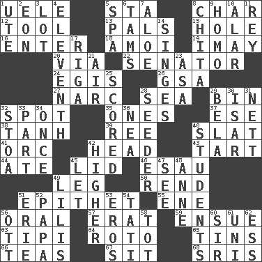 ACROSS 1. Ubangi River tributary 5. R.R. building 8. Burn to charcoal 12. Instrument 13. Friends 15. Hollow 16. Keyboard key 18. Mine, in Marseilles 19. "If ____ say so..." 20. By way of 22. Elected representative 24. Armor plate that protects the chest 26. Girls' org. (abbr.) 27. Drug cop 28. Ocean 29. Storage container 32. Specific locale 35. Singles 37. Compass dir. 38. Hyperbolic tangent 39. To riddle 40. Narrow board 41. The grampus (Milton) 42. Froth on beer 43. Small pie 44. Had dinner 45. Hat (slang) 46. Son of Isaac 49. Part of a journey 50. Tear apart 51. Curse 55. Compass dir. 56. Spoken 57. Part of Q.E.F. 59. Take place subsequently 63. Native american tent (variation) 64. Printing process, for short 65. Metal containers 66. Beverages made from leaves 67. Be seated 68. Indian titles of respect DOWN 1. Shoshoni 2. Period of immesurable duration 3. Car dealer's back yard 4. Veterans Day date 5. Health resort 6. Scottish caps 7. Medicinal plant 8. Riviera of "Kiss of the Spider Woman" 9. Like (prefix) 10. Having or resembling wings 11. Marina Del _, California 14. Scorches 17. Port city in Latvia 21. Wind 23. White ___ sheet 25. Tallied 28. Sowing specialist 29. Actor Lugosi 30. Austrian river, tributary to the Danube 31. Remaining after all deductions 32. Portico 33. Piece 34. At one time in the past 36. Teachers' org. 40. SAT takers 42. Having greater elevation 45. Allow 47. Perceive with the eye 48. Queen of England 1702-14 49. Ms. Damita and namesakes 51. One of the Great Lakes 52. Dad 53. Greek god of love 54. Jacques of French films 56. Baseball player Mel 58. Small child 60. Title for a knight 61. Single; one (prefix) 62. Curvy letter