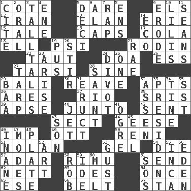 ACROSS 1. ____ d'Azur (French Riviera) 5. Have the gumption 9. Raised railways 12. SW Asia republic 13. Enthusiasm 14. 4th largest of the Great Lakes 15. Falsehood 16. Smile enhancers 17. Root beer relative 18. Pipe bend 19. Air pressure measure (abbr.) 21. "The Thinker" sculptor 22. Pulled tight 24. ___ good deed 26. Double-curved letter 27. Tarsus (plural) 28. Trig term 29. Indonesian resort city 30. Rob, plunder, or pillage 32. Tenement units (abbr.) 36. Ancient Greek god of war 37. River (Sp.) 38. Indian titles of respect 39. Domed church section 40. Secret group 42. Transmitted 43. Religious group 44. Honkers 46. Naughty child 49. Baseball player Mel 50. Painter Guido (1575-1642) 51. Pitcher Ryan 53. Set 54. Expire 57. The sixth month of the Jewish calendar 58. Tall New Zealand timber tree 61. Post 62. Remaining after all deductions 63. Lyric poems 64. At one time in the past 65. Compass dir. 66. Waist strap 67. Comedian Laurel of Laurel & Hardy DOWN 1. Quote 2. Taken by mouth 3. Baron Munchausen's specialties 4. Compass dir. 5. Tenth: prefix 6. Chicken ___ king 7. Hit sharply and swiftly 8. Followers of ems 9. Eat (away) 10. Ms. Damita and namesakes 11. Seines 14. Environmental prefix 19. Suppuration 20. Disorderly outburst 21. Actress Charlotte 23. Originate 24. A piece of turf (Scot.) 25. Single 27. Canvas cover 28. Inhabitant of Heaven 29. Sound made by sheep 31. Spew [out] 32. NE Netherlands city 33. Elected leader of a country 34. Prong on a fork 35. Fast jet (abbr.) 40. Passenger plane 41. Legendary monster 43. Manchild 45. Snakelike fish 46. Lacking in sense or substance 47. Methods 48. Food holder 52. Nonscientific branch of learning 53. Abrupt rush of wind 55. South American Indian 56. Paradise 58. Director Reiner 59. Binary compound 60. Cartoonist voice _ Blanc 61. Distress signal