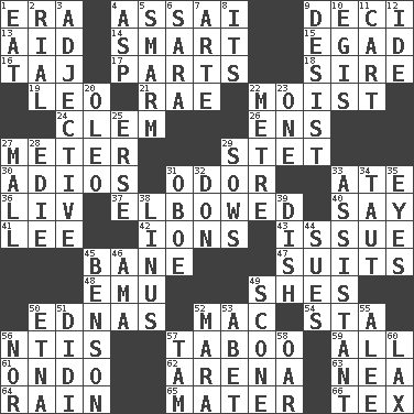 ACROSS 1. Period 4. Slender Brazilian palm 9. Tenth: prefix 13. Assist 14. Don Adams' spy role 15. Mild oath 16. _ Mahal 17. Pieces 18. Father 19. Lion 21. Actress Charlotte 22. Damp 24. Clement's nick name 26. Followers of ems 27. Distance measurement 29. Proofreading order 30. Goodbye (Sp.) 31. Scent 33. Had dinner 36. 54 in ancient Rome 37. Turned at an angle; bent 40. Declare 41. Area sheltered from the wind 42. Charged particles 43. Come out of 45. Object of repulsion 47. Costumes for special activities 48. Australian flightless bird 49. "______ My Girl" (Turtles hit) 50. Ferber et al. 52. Apple computer (short form) 54. R.R. building 56. Nuclear Threat Initiatives 57. Off limits 59. 100% 61. Southwest Nigerian state 62. Sports stadium 63. Teachers' org. 64. Precipitation 65. Mother 66. John Ritter's dad DOWN 1. Consume 2. Monetary unit of Yemen 3. Descriptive word 4. Viper 5. Excessive but superficial compliments 6. "Two Mules for Sister ____" 7. Johnson of "Laugh-In" 8. ___ a Wonderful Life 9. Cease 10. Armor plate that protects the chest 11. Heavy open wagon 12. Binary compound 20. Margarine 22. Distance measurement (Brit.) 23. Single 25. Celtic language 27. Shopping center 28. Singer Brickell 29. Sty mamas 31. Mitch Miller's instrument 32. Spanish title 33. Helper 34. Drawn tight 35. Sight organs 38. "_ and Lucy" (Charlie Brown theme song) 39. Food container 44. Institutes legal proceedings 45. Gillaume's butler role 46. Housemaid (var.) 49. Biscuitlike quick bread 50. Inactive volcano in Sicily 51. "You Light Up My Life" star Conn 52. Hindu Mythology: god of death 53. Collude with 55. Toward shelter 56. Or not 57. Scottish cap 58. Boat paddle 60. Not strict