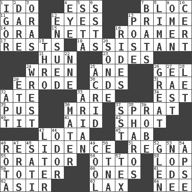 ACROSS 1. Wedding promise 4. Curvy letter 7. Coalition 11. Slender fish 12. Sight organs 13. First class 14. Mouth or opening 15. Remaining after all deductions 16. Wanderer 17. Musical pauses 19. Aide 21. Attila the _ 23. Lyric poems 24. Songbird 25. One (Scot) 26. Set 29. Eat (away) 30. Music discs 31. Actress Charlotte 32. Had dinner 33. "We ___ not amused" (Victoria) 34. Eastern Standard Time (abbr.) 35. Fluid product of inflammation 36. Medical imaging device (abbr.) 37. Small fatty European fish 40. Teat (slang) 41. Assist 42. Went for two points 43. Globular water bottle used in Asia 45. Bar bill 46. Home 51. Canadian anthropologist Darnell 55. Speaker 56. "Beetle Bailey" pooch 58. Trim (branches) 59. Carrier 60. Singles 61. Begley and Asner 62. SW Saudi Arabia district 63. Not strict 64. Born DOWN 1. Composer Stravinsky 2. Have the gumption 3. Mouths or openings 4. Sight organ 5. Bristle 6. Fast planes 7. Naughty children 8. Pale green bean 9. Sign of something about to happen 10. Certainty 12. Took place subsequently 13. Airs 16. Amusement-park features 18. Through, poetically 20. Something which is sent 22. Compass dir. 24. Obtain by seizing forcibly or violently 25. Bitter 26. Relatively large 27. 90 degrees 28. Allow 29. Needle case 32. Fitting 33. Believer in; advocate of (suffix) 36. Mother 37. Fast jet (abbr.) 38. N Egypt peninsula 39. Loose flowing garment 43. 61 cubic inches 44. Scent 46. Roll call or roster of names 47. Greek god of love 48. Suttee (variant) 49. Calm and collected 50. Inactive volcano in Sicily 52. Small, secluded valley 53. Connecting point 54. Domed church section 57. John Ritter's dad