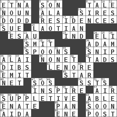 ACROSS 1. Inactive volcano in Sicily 5. Boy, to dad 8. Story 12. Part of speech 13. According to 14. Fathers 15. Texas town _ City 16. Dwellings 19. Take to court 20. Of or relating to Laos or its people 21. Son of Isaac 23. Indiana (abbr.) 24. Connecticut Ivy Leaguer 27. Stricken, poetically 30. First of billions? 31. Soup utensils 34. Sever or remove by pinching or nipping 35. Jai _ 38. Music written for nine 40. Small boys 41. Claim 42. Poe poem 44. Give off 45. Play the lead 46. Fish or hair follower 47. Distress signal 50. Fast planes 53. Heighten or intensify 57. Atmosphere 59. Supplementary 63. Competent 64. Maternal 65. Baking dish 66. Within a short period 67. Opera by Verdi 68. Compass dir. 69. Mail DOWN 1. Conclusions 2. Woman's close-fitting hat 3. Unclothed pictures 4. Plus 5. "Two Mules for Sister ____" 6. Margarine 7. Political cartoonist Thomas 8. Metal container 9. Curve 10. Area sheltered from the wind 11. Double-curved letter 14. Post 17. One more than two 18. Daniel's nick name 20. Mass 22. Aid 24. Pulitzer Prize-winning author Ferber 25. Put down 26. Naughty children 28. Electrically charged atom 29. Instrument 30. Michaelmas daisies 32. Compass dir. 33. Elected reps. 35. An important port of Yemen 36. Welles in "The Third Man" 37. "This won't hurt ____!" 39. Small child 43. To erase 47. Filth; sediment 48. Single 49. Fast jet (abbr.) 51. Off limits 52. Grain storage towers 54. Corncob 55. _ the terrible 56. French philosopher Descartes 58. Monthly bill 59. Ocean 60. University (slang) 61. Writing tablet 62. Parent Teacher Association (abbr.) 63. Viper