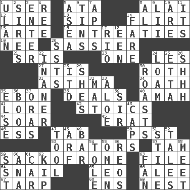 ACROSS 1. One who uses or employs something 5. "One Day ___ Time" 8. Mountain range southwest of Kyrgyzstan 12. Actor's bit 13. Small drink 14. Seductive woman who exploits men 15. Johnson of "Laugh-In" 16. Pleas 19. Born 20. More disrespectful 21. Indian titles of respect 23. Single 24. French article 27. Nuclear Threat Initiatives 30. Writer of Portnoy's Complaint (1969) 31. Respiratory problem 34. Pledge 35. Inky black, to poets 38. Allots cards 40. Nanny 41. Old wives' tales, e.g. 42. Unemotional ones 44. Fly high 45. Part of Q.E.F. 46. Double-curved letter 47. Keyboard key 50. Inconspicuous attention getter 53. Speakers 57. Scottish cap 59. Italian handbag shop? 63. Do some clerical work 64. Slow-paced one 65. Lion 66. Toward shelter 67. Canvas cover 68. Followers of ems 69. A home for chicks DOWN 1. Uhlan (variant) 2. Founders of families 3. Keyboard key 4. To separate or throw off 5. At sea 6. Metal containers 7. Flats, for short 8. The first octave above the treble staff 9. Cards in a Roman deck? 10. "We ___ not amused" (Victoria) 11. ___ a Wonderful Life 14. Conductor's collection 17. _ de Janeiro 18. Car or cant ending 20. Fast planes 22. More empty; more void 24. Rich soil 25. Singer James 26. Quiet! 28. It would 29. "______ My Girl" (Turtles hit) 30. Cooks with dry heat, as in an oven 32. Floor protector 33. Medicinal plant 35. Otherwise 36. Expressions of contempt or scorn 37. Mouths or openings 39. Title for a knight 43. Smile enhancers 47. Utensil 48. Sandy's bark 49. Drinking establishment 51. Vertical member of a panel or frame 52. Stories 54. Lacquered or enameled metalware 55. Presage 56. Vintage cars 58. Rendezvous 59. Fast jet (abbr.) 60. Santa ___, CA 61. Automobile 62. Monetary unit of Laos 63. Air blower
