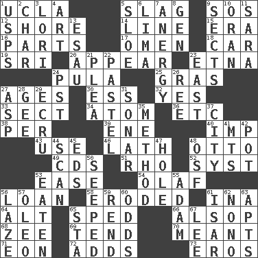 ACROSS 1. Southern CA. univ. 5. Volcanic refuse 9. Mayday 12. Dinah or Pauly 14. Actor's bit 15. Period 16. Pieces 17. Sign of things to come 18. Auto 19. _ Lanka 20. Become visible 23. Inactive volcano in Sicily 24. Monetary unit of Botswana 25. Pate de foie ____ 27. Eras 30. Curvy letter 32. It is so 33. Religious group 34. Smallest unit of an element 36. And so on (abbr.) 38. For each 39. Compass dir. 40. Mischievous child 43. Purpose 46. Thin strip of wood or metal 48. "Beetle Bailey" pooch 49. Music discs 51. 17th letter of the Greek alphabet 52. System (abbr.) 53. Relaxation 54. Norwegian king 56. Grant temporary use of 58. Eaten away 61. _ tizzy (2 wds.) 64. Keyboard modifier key 65. Broke a traffic law 66. Columnist Joseph or Stewart 68. Last letter of the English alphabet 69. Be inclined (to) 70. Intended 71. Age 72. Does sums 73. Greek god of love DOWN 1. United States Postal Service (abbr.) 2. Burn to charcoal 3. Australian parrot (variant) 4. Nonscientific branch of learning 5. A type of plum 6. Pale green bean 7. Disorder of the immune system 8. Commissioned mil. rank 9. Religious groups 10. NW Algerian seaport 11. "Two Mules for Sister ____" 13. He sold his birthright 21. Entreaty 22. Soft color 23. Compass direction 24. Pacific Standard Time (abbr.) 26. Portuguese money of account (variant) 27. Viper 28. Turn to the right 29. Shade of tan 31. Underwater navigation system 35. Mode 37. Municipality 41. Mountains (abbr.) 42. Cooking vessel 44. Examine minutely or intensely 45. Begley and Asner 47. Hollow 48. Order of Saint Francis (abbr.) 50. Oozed 53. Ingested 55. First of billions? 56. Goldbrick 57. Margarine 59. Tear apart 60. Likelihood 61. Austrian river, tributary to the Danube 62. Words to Nanette 63. Tenement units (abbr.) 65. R.R. building 67. Area sheltered from the wind
