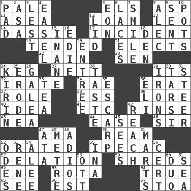 ACROSS 1. Light colored 5. Raised railways 8. Viper 11. At sea 12. Rich soil 13. Lion 14. Small ungulate mammals of Africa 17. Happening 19. Watched over 21. Chooses 22. (Had) reclined 23. Elected rep. 24. Cask 27. Remaining after all deductions 29. ___ a Wonderful Life 32. Feeling or showing extreme anger 34. Actress Charlotte 36. Part of Q.E.F. 37. Hero or heavy, e.g. 38. Double-curved letter 39. Old wives' tales, e.g. 40. The main thing one is thinking about 41. And so on (abbr.) 42. Wash lightly 43. Teachers' org. 44. Relaxation 46. Title for a knight 47. Nursemaid (var.) 50. 480, 500 or 516 sheets of paper 52. Spoke pompously 55. Medicinal drug used to evoke vomiting 57. Accusation by an informer 59. Fragments 62. Compass dir. 63. Roll call or roster of names 64. Loyal 65. Observe 66. Eastern Standard Time (abbr.) 67. Portico DOWN 1. Groovy apt. 2. White ___ sheet 3. For fear that 4. Artist's stand 5. A really long time 6. Shoestrings 7. Grin 8. Actor Baldwin 9. Posted 10. Plant holders 12. Hat (slang) 15. Silly 16. Singer Brickell 18. Lair 20. Main course 24. Japanese brewing company 25. Wear away 26. An organ shaped like a helmet 28. Clothes sense 29. Metal shackles 30. Tarsus (plural) 31. Bull 33. Beverage made from leaves 35. Fortification 36. Biblical high priest 42. Arrive at 45. Observes 47. "One Day ___ Time" 48. Distance measurement (Brit.) 49. Goodbye (Sp.) 51. Shops 52. Lyric poems 53. French philosopher Descartes 54. Toward shelter 55. _ tizzy (2 wds.) 56. Sure thing 58. Baseball player Mel 60. Superhero pair 61. Ocean
