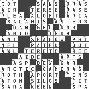 ACROSS 1. Small bed 4. Without 8. Mouths or openings 12. Atmosphere 13. Laconic 14. Raze (variant) 15. Entreaty 17. At or to great height 18. Roberta Peters solo 19. Deli grouping 21. Michaelmas daisies 23. Daniel's nick name 24. Set 26. Or not 27. Among 28. Composer Stravinsky 30. Cuckoo 31. Manatee 34. Pacific Standard Time (abbr.) 37. Cartoonist voice _ Blanc 38. Eucharist need 39. Fr. "Yes" 40. Leather borer 41. Cylindrical with tapered ends 42. To sift 43. Helper 44. Flats, for short 46. Viper 47. Morning condensation 50. Slender fish 51. Northern region 54. Devices for capturing images 57. Writer of Portnoy's Complaint (1969) 58. To the left, to Queeg 60. Metal containers 62. Smallest unit of an element 63. Grain storage towers 64. Teat (slang) 65. "Two Mules for Sister ____" 66. Peachy ____! 67. Health resort DOWN 1. Head covering 2. Lubricates 3. Excercise machine 4. Former Milwaukee Brewers owner Bud 5. Came up 6. Science/research agcy. 7. Bristle 8. Speaker 9. Less widely known 10. SW Saudi Arabia district 11. Oceans 13. Scottish cap 16. Jai _ 20. Added to 22. Overwhelm 25. It is permitted: Lat. 27. Afresh 29. Went 30. Nanny (var.) 31. Drove too fast 32. Having ears or earlike features 33. Had dinner 34. Likenesses of persons 35. Institutes legal proceedings 36. Standoff 41. Native american tent (variation) 43. Respiratory problem 44. Mature 45. Piece 46. Thespian 48. Learning spot: Fr. 49. Make _____ (do battle with) 51. Ancient river in northeast Turkey 52. Round or rotation of duties 53. Keg 55. Mountains (abbr.) 56. Sever or remove by pinching or nipping 59. Sliced dessert 61. R.R. building