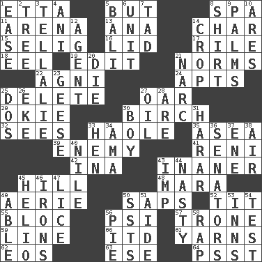ACROSS 1. Singer James 5. On the contrary 8. Health resort 11. Sports stadium 13. Santa ___, CA 14. Burn to charcoal 15. Former Milwaukee Brewers owner Bud 16. Flaplike covering 17. Cause heat under the collar 18. Snakelike fish 19. Prepare for publication 21. Typical standards 22. Hindu god of fire 24. Tenement units (abbr.) 25. Keyboard key 27. Rowing implement 29. Migrant worker of the '30s 30. A tree used for making furniture 32. Observes 33. White Person, in Hawaii 35. Toward the sea 39. Foe 41. Painter Guido (1575-1642) 42. _ tizzy (2 wds.) 43. Sillier 45. Land elevation 48. Hindu Mythology: god of death 49. Nest on high 50. Plant excrements 52. Teat (slang) 55. Coalition 56. 23rd letter of the Greek alphabet 57. Marketplace scale 59. Actor's bit 60. It would 61. Entertaining tales 62. Greek goddess of the dawn 63. Compass dir. 64. Inconspicuous attention getter DOWN 1. Comfort 2. Family _ (genealogy) 3. Copy Pinocchio 4. Black tropical American cuckoo 5. Indonesian resort city 6. A single undivided whole 7. Small boy 8. Upper-body garment 9. Insides of hands 10. Ancient Greek god of war 12. Rep 14. Riding implement 20. Pass on 21. Drug cop 23. Honkers 25. Two (Sp.) 26. Supplement with great effort 27. Lubricate 28. "We ___ not amused" (Victoria) 30. Male child 31. Ethiopian city, capital of Harari 33. Layer 34. Housemaid (var.) 36. Elected representatives 37. Compass dir. 38. Atmosphere 40. The longest river in the world 43. Naughty child 44. Thoroughly unpleasant 45. Sun: prefix 46. Removes the wrinkles 47. Louse (plural) 49. Competent 50. Fast planes 51. Helper 53. Restaurants 54. Trial 56. Sliced dessert 58. Strike