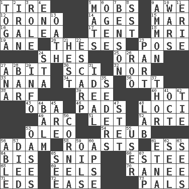 ACROSS 1. Hoop that covers a wheel 5. Disorderly crowds 9. Deep reverence 12. U. of Maine site 14. Eras 15. Spoil 16. An organ shaped like a helmet 17. Portable shelter 18. Medical imaging device (abbr.) 19. One (Scot) 20. College papers 23. Airs 24. "______ My Girl" (Turtles hit) 25. NW Algerian seaport 27. "This won't hurt ____!" 30. _-fi 32. And not 33. Nanny 34. Bits 36. Baseball player Mel 38. Sandy's bark 39. To riddle 40. Being at a high temperature 43. Chief or king in Benin or Nigeria 46. Groovy apts. 48. Venues 49. Curve 51. Allow 52. Johnson of "Laugh-In" 53. Butter sub 54. Reuben's nickname 56. First of billions? 58. Cooks with dry heat, as in an oven 61. Double-curved letter 64. Again 65. Sever or remove by pinching or nipping 66. First name in cosmetics 68. Area sheltered from the wind 69. Snakelike fish 70. The wife of a rajah (variant) 71. Begley and Asner 72. Comfort 73. Friends DOWN 1. Ancient Roman robe 2. SW Asia republic 3. Hero or heavy, e.g. 4. Compass dir. 5. Floor coverings 6. Double curve, resembling the letter S 7. Gillaume's butler role 8. Fast jet (abbr.) 9. ID or VA city 10. Armed conflicts 11. One of the Great Lakes 13. Pledge 21. Command 22. Fortification 23. Piece 24. R.R. building 26. Friend of Pooh 27. Santa ___, CA 28. Long, evenly shaped piece 29. A message received and understood 31. Perfect 35. Spring feasts 37. Son of Odin 41. Sep. follower 42. Neckwear 44. Lip ointment 45. "We ___ not amused" (Victoria) 47. Proofreading order 48. Experiment locale 50. Pupil covering 53. Fertile tracts in a desert 55. One who makes use of a thing 56. Competent 57. Passed on 59. Petroleums 60. Domed church section 61. Inactive volcano in Sicily 62. Stitch closed the eyes of (a falcon) 63. Perceives with the eye 65. Perceive with the eye 67. Plant excrement