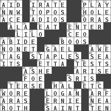ACROSS 1. Help 4. Feeling or showing extreme anger 9. Shaw product 13. Compass dir. 14. Literary convention 15. Hollow 16. Adept person 17. Goodbye (Sp.) 18. Mouths or openings 19. Insect wing 21. Consume 22. Keyboard key 24. _ and Stitch 26. Corporate head (abbr.) 27. Stay 29. Expressions of contempt or scorn 30. Music written for nine 31. Highlander 33. Deep reverence 36. Label 37. Paper fasteners 40. Ocean 41. It is 42. Singer James 43. Trials 45. American tennis player Robert 47. Ascend 48. Enemy 49. Indian titles of respect 50. Laconic 52. Actor Linden 54. And so on (abbr.) 56. Had on 57. Utah city north of Ogden 59. Sandy's bark 61. Ancient river in northeast Turkey 62. Bert's buddy 63. Teachers' org. 64. Writer of Portnoy's Complaint (1969) 65. Virtuous person 66. Nine, plus one DOWN 1. Santa ___, CA 2. South American Indian 3. Homes 4. Call ___ day 5. Cowboy competition 6. Capital of Western Samoa 7. A blast of a horn 8. Curvy letter 9. Pictures 10. Old wives' tales, e.g. 11. Having or resembling wings 12. Affirmative reply 20. Assistant 22. Learning spot: Fr. 23. Modern: prefix 25. Allows 27. Against 28. Water vessel 29. Actor Lugosi 31. Yard entry 32. Fitting 33. Aide 34. Soaks 35. Relaxation 38. Giggle 39. Play the lead 44. 4th largest of the Great Lakes 45. Anew 46. Mayday 49. Killed 50. "Corrida" creature 51. Part of Q.E.F. 52. Israeli folk dance 53. Hindu god of fire 55. Algonquian 56. Armed conflict 57. French article 58. Fish or hair follower 60. Avid follower