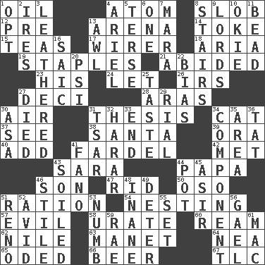 ACROSS 1. Lubricate 4. Smallest unit of an element 8. Oscar Madison type 12. Before (prefix) 13. Sports stadium 14. Puff or smoke 15. Beverages made from leaves 17. One who wires 18. Operatic vocal solo 19. Paper fasteners 21. Stayed 23. Part of HMS, perhaps 24. Allow 26. Big collection agency 27. Tenth: prefix 28. Ancient river in northeast Turkey 30. Wind 31. College paper 34. Domesticated feline 37. Perceive with the eye 38. Before Barbara or Clara 39. Mouth or opening 40. Say or write further 41. Pack 42. Was introduced to 43. "Two Mules for Sister ____" 44. Dad 46. Boy, to dad 47. To free from 50. Bear (Spanish) 51. Food allowance for one day 54. Snuggling 57. Tending to cause great harm 58. A salt of uric acid 60. 480, 500 or 516 sheets of paper 62. "Death on the ____" 63. French painter Edouard 64. Teachers' org. 65. Wrote a lyric poem 66. Fermented drink made from hops 67. Affectionate concern, for short DOWN 1. Elect 2. Angers 3. Resembling or made to resemble leather 4. Satellite of Uranus 5. Laconic 6. Single 7. Hindu Mythology: god of death 8. Flight of steps 9. Titled peers of a realm 10. Migrant worker of the '30s 11. Necklace unit 13. Leather borer 16. Ketch in the Levant 20. Air pressure measure (abbr.) 22. Prejudice 25. Clothes sense 27. Passed on 29. Monetary unit of Yemen 30. White ___ sheet 31. Russian ruler of old 32. Ethiopian city, capital of Harari 33. Conclusion 34. Piece 35. Length times width 36. Make lace 41. Papal veil 43. Dirtied 44. Cooking vessel 45. SW Saudi Arabia district 46. Vertical member of a panel or frame 48. Lacking in sense or substance 49. Prevent from occurring 51. Western Nevada city 52. Enthusiastic 53. Unfeeling 55. Put into a specified state 56. Highlander 59. Actress Charlotte 61. Apple computer (short form)