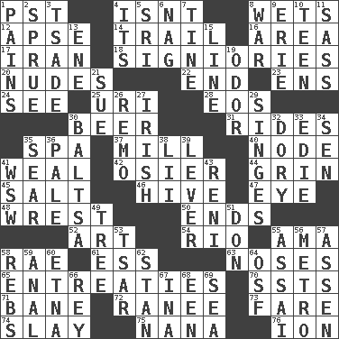 ACROSS 1. Pacific Standard Time (abbr.) 4. Is not 8. Soaks 12. Domed church section 14. Get behind 16. Length times width 17. SW Asia republic 18. Seigniories (variant) 20. Unadorned figures 22. Conclude 23. Followers of ems 24. Observe 25. RI univ. 28. Greek goddess of the dawn 30. Fermented drink made from hops 31. Amusement-park features 35. Health resort 37. Place where flour is made 40. Connecting point 41. Welt 42. Flexible twig of a willow tree 44. Broad smile 45. Table seasoning 46. Hub of activity 47. Sight organ 48. Obtain by seizing forcibly or violently 50. Conclusions 52. Tate display 54. River (Sp.) 55. Wet nurse (var.) 58. Actress Charlotte 61. Curvy letter 63. Olfactory organs 65. Pleas 70. Fast planes 71. Object of repulsion 72. Indian princess (variant) 73. Conductor's collection 74. Kill 75. Nanny 76. Electrically charged atom DOWN 1. Aches 2. Upset 3. Sadhe (variant) 4. ___ a Wonderful Life 5. _ Lanka 6. Tired old horse 7. Prong on a fork 8. Armed conflict 9. 4th largest of the Great Lakes 10. Adolescent 11. Backtalk 13. Compass dir. 15. Actor's bit 19. Aroma 21. Take to court 26. San ____ (Riviera town) 27. From or relating to Ireland 29. Burns superficially 30. Greek mezzo-soprano Agnes 32. Rowboat 33. Singer Brickell 34. Elected rep. 35. Scorch 36. Light colored 38. Cards in a Roman deck? 39. Crowbar 41. Compass dir. 43. Painter Guido (1575-1642) 49. Woody plant 51. Spanish title 53. Russian ruler of old 55. Slender Brazilian palm 56. Paris' subway 57. NE Netherlands city 58. Confederate soldiers (slang) 59. Of or related to the anus 60. Inactive volcano in Sicily 62. Comedian Laurel of Laurel & Hardy 64. Order of Saint Francis (abbr.) 66. Marina Del _, California 67. _ tizzy (2 wds.) 68. Car or cant ending 69. Ocean