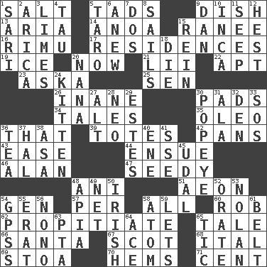 ACROSS 1. Table seasoning 5. Bits 9. Food container 13. Roberta Peters solo 14. Small Philippine buffalo 15. The wife of a rajah (variant) 16. Tall New Zealand timber tree 17. Dwellings 19. Frozen water 20. At this time 21. Cards in a Roman deck? 22. Fitting 23. "____ silly question..." 25. Elected rep. 26. Silly 30. Groovy apts. 34. Stories 35. Margarine 36. Not this but _ 39. Hauls 42. Baking dishes 43. Relaxation 44. Take place subsequently 46. ____ Jay Lerner 47. Morally degraded 48. Black tropical American cuckoo 51. A really long time 54. Commissioned mil. rank 57. For each 58. Everything 60. Director Reiner 62. Appease 65. Story 66. Before Barbara or Clara 67. Native of Scotland 68. Slanted text style (abbr.) 69. Portico 70. Cloth borders 71. Penny DOWN 1. Indian skirt 2. N. Chile seaport 3. Citrus fruits 4. The 19th letter of the Greek alphabet 5. Pacific island yam 6. Afresh 7. Two (Sp.) 8. Travel by water 9. Daniel's nick name 10. South American Indian 11. Ooze 12. Command 15. It's straight from the horse's mouth 18. Pass on 20. Nanny 24. Baby cat 27. Keyboard modifier key 28. Modern: prefix 29. _____ Park, CO 30. Wimpy's pal 31. Insect wing 32. Lair 33. Mayday 36. Beverage made from leaves 37. Actor Linden 38. White ___ sheet 40. Compass dir. 41. Compass dir. 45. Freehold land 48. Capital of Western Samoa 49. Fish or hair follower 50. From or relating to Ireland 52. Declaim 53. Pitcher Ryan 54. Global Positioning Systems (abbr.) 55. Part of Q.E.F. 56. Words to Nanette 58. Smallest unit of an element 59. Allows 61. Waist strap 63. Parent Teacher Assoc. 64. Adept person 65. Nervous spasm
