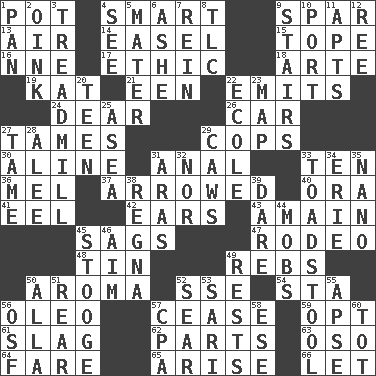 ACROSS 1. Plant holder 4. Don Adams' spy role 9. Coast Guard woman 13. Wind 14. Artist's stand 15. Drink excessively 16. Compass dir. 17. Principle of right and wrong 18. Johnson of "Laugh-In" 19. Krazy ___ of comics 21. Car or cant ending 22. Gives off 24. Letter starter 26. Automobile 27. Corrects by punishment or discipline 29. 911 reaches them 30. Place in a line 31. Of or related to the anus 33. Nine, plus one 36. Cartoonist voice _ Blanc 37. Moved like an arrow 40. Mouth or opening 41. Snakelike fish 42. Hearing organs 43. With great haste 45. Settles 47. Cowboy competition 48. Shallow baking pan 49. Confederate soldiers (slang) 50. Scent 52. Compass dir. 54. R.R. building 56. Butter sub 57. Stop 59. Elect 61. Volcanic refuse 62. Pieces 63. Bear (Spanish) 64. Conductor's collection 65. Get up 66. Allow DOWN 1. Baking dish 2. Pig sound 3. Excercise machine 4. Observe 5. Mother 6. American tennis player Robert 7. It's straight from the horse's mouth 8. Affectionate concern, for short 9. Flight of steps 10. Left side of a ship or aircraft 11. Flats, for short 12. Portuguese money of account (variant) 20. Adolescent 22. Learning spot: Fr. 23. Atlas unit 25. Toward the sea 27. Not wild 28. Toward shelter 29. Crow sounds 31. Caspian sea tributary 32. Or not 33. Inedible or poisonous agaric 34. 4th largest of the Great Lakes 35. Billionth: prefix 38. Canadian anthropologist Darnell 39. Have the gumption 44. Disorderly crowds 45. Moe Howard, for one 46. Direct toward a target or goal 49. Musical pauses 50. Silent film actress Nazimova 51. Located in or toward the back 52. Burn superficially 53. Indian skirt 55. Domed church section 56. Order of Saint Francis (abbr.) 57. Numbers guy (abbr.) 58. Compass dir. 60. Small child