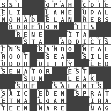 ACROSS 1. Fast jet (abbr.) 4. Brightly colored fish 8. ____ d'Azur (French Riviera) 12. Connecticut Ivy Leaguer 13. Unable to walk 14. Hereditary estate 15. Roamer 18. Style 19. Confederate soldiers (slang) 20. Mood resulting from idleness 22. ___ a Wonderful Life 23. French philosopher Descartes 24. Call ___ day 25. R.R. building 26. Inveterate users 30. Followers of ems 33. Role for Stallone 36. Be tempered by heat 37. Carrot, for example 39. Ocean 40. Filth; sediment 41. Scent 42. Short, simple song 44. Directed 45. Elected representative 47. Eastern Standard Time (abbr.) 50. Player for Phoenix 51. Path through which fluid escapes 53. A female animal or person 54. Deli grouping 57. Ketch in the Levant 59. Locale of original sin 61. Small fatty European fish 63. Inactive volcano in Sicily 64. Grant temporary use of 65. Lyricist Gershwin 66. Adolescent 67. Female horse 68. Tired old horse DOWN 1. Elected rep. 2. Oscar Madison type 3. Southeast Indonesia island 4. Butter sub 5. Inside of hand 6. Housemaid (var.) 7. Layer 8. Window treatments 9. Lyric poems 10. Keyboard key 11. Raised railways 16. Ancient Greek god of war 17. Incision 21. Letter starter 22. It would 24. Wedding promise 26. Blind as ____ 27. To provide with a ceiling 28. Story 29. Downhill vehicle 30. Greek god of love 31. Connecting point 32. Within a short period 34. SW Saudi Arabia district 35. Was introduced to 38. File 13 42. Spanish title 43. Shout 46. Third day of the wk. 48. Oceans 49. Pack (down) 52. Japanese brewing company 53. Trig term 54. Shrivel 55. Singer Murray 56. "Two Mules for Sister ____" 57. Arrange properly for use 58. Had dinner 59. Shade tree 60. ___ good deed 62. Label