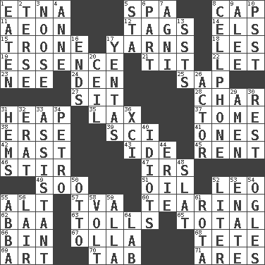 ACROSS 1. Inactive volcano in Sicily 5. Health resort 8. Head covering 11. A really long time 12. Labels 14. Raised railways 15. Marketplace scale 17. Tall tales 18. French article 19. Core 21. Teat (slang) 22. Allow 23. Born 24. Lair 25. Plant excrement 27. Be seated 28. Burn to charcoal 31. Pile 35. Not strict 37. Heavy book 38. Celtic language 39. _-fi 41. Washington bills 42. Vertical spar for supporting sails 43. Binary compound 45. Monthly bill 46. Commotion 47. Big collection agency 49. "Barney Miller" actor Jack 51. Lubricate 52. Lion 55. Keyboard modifier key 57. Federal power corp. 60. Lacerating 62. Sound made by sheep 63. For Whom the Bell _____ 65. "_____ Recall" 66. Storage container 67. Spanish pot 68. False hair 69. Nonscientific branch of learning 70. Keyboard key 71. Ancient Greek god of war DOWN 1. Eroded 2. Laconic 3. Trap for birds or small mammals 4. Singer Murray 5. R.R. building 6. Component 7. Hindu god of fire 8. Portable communications device 9. Toward shelter 10. Inconspicuous attention getter 13. Fast planes 16. Conclusions 17. Gossips 20. To provide with a ceiling 26. Thespian 29. So be it 30. Relief 31. Cloth borders 32. Part of Q.E.F. 33. Helper 34. Stone: prefix 36. One more than ninety 40. Foolish or stupid persons 44. One of the Great Lakes 48. Narrow board 50. "Beetle Bailey" pooch 52. 61 cubic inches 53. Related on the mother's side 54. Stares 55. Swedish rock group 56. Den 58. Electrical Unit 59. Silent film actress Nazimova 61. Round or rotation of duties 64. Experiment locale