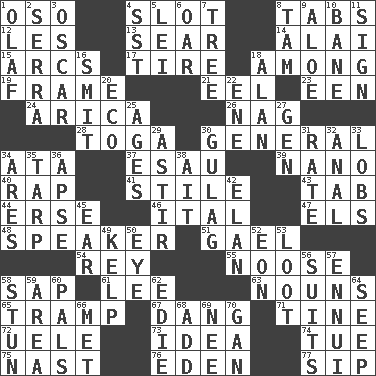 ACROSS 1. Bear (Spanish) 4. Notch 8. Bar bills 12. French article 13. Burn superficially 14. Jai ____ 15. Curves 17. Hoop that covers a wheel 18. Amid 19. Movie unit 21. Snakelike fish 23. Car or cant ending 24. N. Chile seaport 26. Tired old horse 28. Ancient Roman robe 30. Commissioned military rank 34. "One Day ___ Time" 37. Son of Isaac 39. Billionth: prefix 40. Strike 41. Vertical member of a panel or frame 43. Keyboard key 44. Celtic language 46. Slanted text style (abbr.) 47. Raised railways 48. Orator 51. Highlander 54. Marina Del _, California 55. Trap for birds or small mammals 58. Plant excrement 61. Area sheltered from the wind 63. Parts of speech 65. _____ steamer (cargo ship) 67. Mild oath, euphamism for damn 71. Prong on a fork 72. Ubangi River tributary 73. It may be bright or harebrained 74. Third day of the wk. 75. Political cartoonist Thomas 76. Paradise 77. Small drink DOWN 1. Norwegian king 2. Spanish missionary in California 3. Motion picture award 4. Fast jet (abbr.) 5. Luau accessory 6. Rowing implement 7. Relationship diagram 8. Scottish cap 9. _ vera 10. Object of repulsion 11. Attach a signature 16. Stricken, poetically 18. Actor Alda or Thicke 20. Environmental prefix 22. Compass dir. 25. Matures 27. Commissioned mil. rank 29. Moving or stirring 30. Russian prison camp 31. Assign a rank or rating to 32. Of or related to the anus 33. Tennis shots 34. Ancient Greek god of war 35. Canvas cover 36. Domed church section 38. Small island 42. Style 45. Hearing organ 49. Seaweed 50. Sight organ 52. A really long time 53. Plunder 56. Costumes for special activities 57. World-weariness 58. Surprise greatly 59. Type of rug 60. Friends 62. Singer Brickell 64. Ooze 66. Was introduced to 68. Say or write further 69. Born 70. Separate the seeds from cotton
