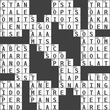 ACROSS 1. Comedian Laurel of Laurel & Hardy 5. 23rd letter of the Greek alphabet 8. Three (prefix) 11. Falsehood 12. Elects 14. Rowing implement 15. Leaves out 17. Debaucheries 18. Alias (abbr.) 19. Small, flat, pigmented spot on the skin 21. Small child 22. Lair 23. Compass dir. 24. Auto club (abbr.) 25. Mayday 27. Mountains (abbr.) 28. Tiny particle 31. Lettered men learn these first 35. And so on (abbr.) 37. Lacquered or enameled metalware 38. Female horse 39. "Barney Miller" actor Jack 41. Hollow 42. Small Philippine buffalo 43. Before (prefix) 45. Narrow board 46. Command 47. Raised railways 49. Fast jet (abbr.) 51. Pet locale 52. Lion 55. The 23rd letter of the Hebrew alphabet 57. One (Scot) 60. Catching in a trap 62. Wedding promise 63. Distance measurement (Brit.) 65. "_____ Recall" 66. For each 67. Baking dishes 68. Wig 69. Indiana (abbr.) 70. Not strict 71. Ancient Greek god of war DOWN 1. Took without asking 2. Corrects by punishment or discipline 3. Place in a line 4. Remaining after all deductions 5. Luau course 6. Blemish 7. "Tell ____ the Marines!" 8. Inedible or poisonous agaric 9. Libertine 10. SW Asia republic 13. Fast planes 16. Thailand, formerly 17. Exposes to great heat 20. Yard entry 26. Expletives 29. Spanish pot 30. Confront 31. Nursemaid 32. Object of repulsion 33. What you're doing now 34. Theater features 36. Police officer (slang) 40. Threatening words 44. Style 48. Argument over a trivial matter 50. Pack (down) 52. 61 cubic inches 53. Maternal 54. Stares 55. Native american tent (variation) 56. An important port of Yemen 58. Actress Patricia 59. Inactive volcano in Sicily 61. Roll call or roster of names 64. Acura sports coupe
