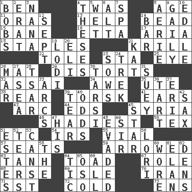 ACROSS 1. Benjamin's nick name 4. It was, poetically 8. Ripen 11. Mouths or openings 13. Assist 14. Necklace unit 15. Object of repulsion 16. Singer James 17. Operatic vocal solo 18. Paper fasteners 21. Shrimp-like planktonic crustaceans 22. Lacquered or enameled metalware 23. R.R. building 25. Sight organ 26. Floor protector 29. What propaganda does 32. Slender Brazilian palm 34. Deep reverence 35. Shoshoni 38. Stern 39. Cod relative 41. Hearing organs 43. Curve 44. Begley and Asner 45. Damascus' land 46. Most questionable 50. John Ritter's dad 51. And so on (abbr.) 54. Big collection agency 55. Small bottle 57. Theater features 59. Moved like an arrow 63. Hyperbolic tangent 64. Frog relative 67. Hero or heavy, e.g. 68. Celtic language 69. Small island 70. SW Asia republic 71. Fast jet (abbr.) 72. Having a low temperature 73. Followers of ems DOWN 1. Moves up and down 2. Part of Q.E.F. 3. Nanny 4. College papers 5. Soggy 6. The first octave above the treble staff 7. Health resort 8. Nest on high 9. Lightheartedly 10. Peak District village in England 12. Back-to-school mo. 14. Long, evenly shaped piece 19. Farming town in central California 20. Biblical high priest 21. Krazy ___ of comics 23. Sty mamas 24. Long journey 26. Third mo. 27. Toward the sea 28. Russian ruler of old 30. Tarsus (plural) 31. Chop _ 33. Arches 36. Small pie 37. One of the Great Lakes 39. Separate forcefully 40. Probability 42. Saxophone 45. Play the lead 47. Part of HMS, perhaps 48. Dodged 49. Title for a knight 51. _____ Park, CO 52. Pulls apart 53. 2nd pers. sing. pres. of can (arch.) 56. Australian parrot (variant) 58. Definite Article 60. Had on 61. Liveliness 62. Cub Scout units 64. Nervous spasm 65. Bear (Spanish) 66. Everything