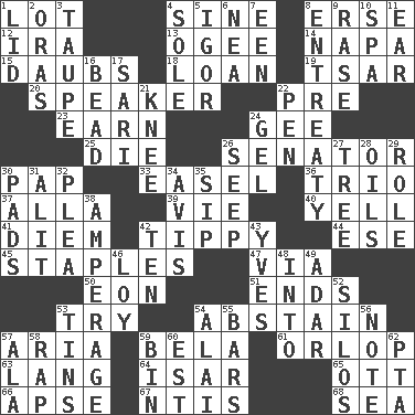 ACROSS 1. Car dealer's back yard 4. Trig term 8. Celtic language 12. Retirement account (abbr.) 13. Double curve, resembling the letter S 14. California wine valley 15. Applies to a surface 18. Grant temporary use of 19. Russian ruler of old 20. Orator 22. Before (prefix) 23. Merit 24. Turn to the right 25. Expire 26. Legislator 30. Infant food 33. Artist's stand 36. Musical group of three 37. Silent film actress Nazimova 39. Compete 40. Shout 41. South Vietnam president (1954) 42. Likely to tip or tilt 44. Compass dir. 45. Paper fasteners 47. By way of 50. A really long time 51. Conclusions 53. Attempt to accomplish something 54. Refrain by choice 57. Operatic vocal solo 59. Actor Lugosi 61. Lowest deck of a ship 63. Austrian-born American filmmaker Fritz 64. Austrian river, tributary to the Danube 65. Baseball player Mel 66. Domed church section 67. Nuclear Threat Initiatives 68. Ocean DOWN 1. Flaplike covering 2. Mouths or openings 3. Grayish beige 4. Not divided or shared with others 5. Russian composer Stravinsky 6. Teachers' org. 7. Car or cant ending 8. Plea 9. Raze (variant) 10. Health resort 11. Ewer handle 16. Necklace unit 17. Indian skirt 21. Leg joint 22. Writing instrument 24. Set 26. Ooze 27. Woody plant 28. Lubricates 29. Hero or heavy, e.g. 30. Groovy apts. 31. Came down and settled, as after flight 32. Entreaty 34. Advice 35. Small drink 38. Electrical Measurement 42. "___ Little Indians" 43. Jacques Cousteau's middle name 46. Myrna of the movies 48. To the inside or interior of 49. The sixth month of the Jewish calendar 52. Grain storage towers 53. Metal containers 54. Jai ____ 55. Oblong pieces of solid material 56. Short letter 57. According to 58. Reproach for some lapse or misdeed 59. Storage container 60. Eastern Standard Time (abbr.) 62. Parent Teacher Assoc.
