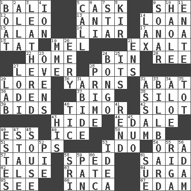 ACROSS 1. Indonesian resort city 5. Keg 9. A female animal or person 12. Butter sub 13. Opposed to 14. Grant temporary use of 15. Actor Alda or Thicke 16. One who doesn't tell the truth 17. Small Philippine buffalo 18. Make lace 19. Cartoonist voice _ Blanc 21. Honor 22. Residence 24. Storage container 26. Portuguese money of account (variant) 27. Crowbar 28. Plant holders 29. Old wives' tales, e.g. 30. Entertaining tales 32. Blind as ____ 36. Arabian gulf 37. Large 38. Grain storage tower 39. Auction offers 40. The easternmost of the Lesser Sundas 42. Groove 43. Flintstone garb 44. Peak District village in England 46. Curvy letter 49. Frozen water 50. Unfeeling 51. Halts 53. Wedding promise 54. Mouth or opening 57. "Change" in Tahitian 58. Hurried 61. Alleged 62. Otherwise 63. Assign a rank or rating to 64. Capital and largest city of Mongolia 65. Observe 66. South American Indian 67. Dutch treat DOWN 1. Water vessel 2. Silent film actress Nazimova 3. Resembling or made to resemble leather 4. Electrically charged atom 5. Give a ring to 6. Cuckoo 7. R.R. building 8. Apertif with cassis 9. Underwater navigation system 10. White Person, in Hawaii 11. Related on the mother's side 14. Not strict 19. Madame (abbr.) 20. Suggestive of the supernatural 21. Followers of ems 23. Baking chambers 24. Beat drum 25. It is 27. Farming town in central California 28. A-one 29. Experiment locale 31. Tolerate 32. Indian state 33. Big road sign 34. _ vera 35. Small child 40. Nervous spasm 41. Tear apart 43. Part of HMS, perhaps 45. Superhero pair 46. _____ Park, CO 47. Showing deterioration from age 48. Lush 52. Sliced dessert 53. The main thing one is thinking about 55. Port city in Latvia 56. First of billions? 58. Indian title of respect (Mr.) 59. Baking dish 60. And so on (abbr.) 61. Institute legal proceedings