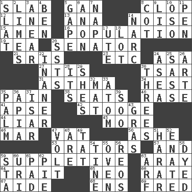 ACROSS 1. Thick slice 5. Separate the seeds from cotton 8. Hoof sound 12. Actor's bit 13. Santa ___, CA 14. Annoying sound 15. So be it 16. Census information 19. Afternoon social gathering 20. Legislator 21. Indian titles of respect 23. And so on (abbr.) 24. White ___ sheet 27. Nuclear Threat Initiatives 30. Russian ruler of old 31. Respiratory problem 34. Behest 35. Ache 38. Theater features 40. Raze (variant) 41. Domed church section 42. Moe Howard, for one 44. One who doesn't tell the truth 45. Greater amount 46. Third mo. 47. Large container 50. American tennis player Robert 53. Speakers 57. Also 59. Supplementary 63. Like ___ of sunshine 64. Distinguishing feature 65. Modern: prefix 66. Pace 67. Helper 68. Followers of ems 69. Flintstone DOWN 1. Narrow board 2. Citrus fruits 3. Approach 4. Benjamin's nick name 5. Open wide 6. At once, immediately (arch.) 7. California wine valley 8. Small bed 9. Cards in a Roman deck? 10. Bear (Spanish) 11. Fenced enclosure 14. Drug cop 17. Shoshoni 18. Car dealer's back yard 20. Fast planes 22. Sillier 24. Toward the sea 25. Backtalk 26. Johnson of "Laugh-In" 28. ___ a Wonderful Life 29. "______ My Girl" (Turtles hit) 30. Triplets 32. Floor covering 33. Tiny particle 35. Inside of hand 36. Capital of Western Samoa 37. Austrian river, tributary to the Danube 39. "Barney Miller" actor Jack 43. Pate de foie ____ 47. Electrical Unit 48. "We ___ not amused" (Victoria) 49. Make lace 51. Ethiopian city, capital of Harari 52. Related on the mother's side 54. Prong on a fork 55. Baking chamber 56. Vintage cars 58. Colored 59. R.R. building 60. RI univ. 61. Writing tablet 62. Sliced dessert 63. Sandy's bark