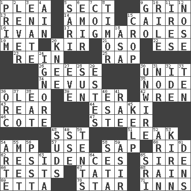ACROSS 1. Entreaty 5. Religious group 9. Smile widely 13. Painter Guido (1575-1642) 14. Mine, in Marseilles 15. Capital of Egypt 16. "Terrible" tsar 17. Frustrating wastes of time 19. Was introduced to 20. Apertif with cassis 21. Bear (Spanish) 22. Compass dir. 23. It's straight from the horse's mouth 25. Reproach for some lapse or misdeed 26. Honkers 30. A single undivided whole 34. Congenital growth or mark on the skin 35. Thickened enlargement 36. Margarine 39. Keyboard key 42. Songbird 43. Hitchcock's "____ Window" 44. 1973 Nobel Price Winner (Physics) Leo 46. ____ d'Azur (French Riviera) 47. Guide 48. Fast jet (abbr.) 51. Path through which fluid escapes 54. Electrical Unit 57. Purpose 58. Plant excrement 60. To free from 62. Dwellings 65. Title for a man of rank and authority 66. Trials 67. Jacques of French films 68. Water falling in drops from the sky 69. Singer James 70. Play the lead 71. Lodging establishments DOWN 1. Demure 2. Crowbar 3. Maternal 4. The 18th letter of the Arabic alphabet 5. Indian skirt 6. Arab leader 7. Gear tooth 8. Southeast Indonesia island 9. E Mali city 10. Cause heat under the collar 11. Angers 12. Olfactory organ 15. Riding implement 18. White ___ sheet 20. Leg joint 24. Disregard 27. Night before a holiday 28. Player for Phoenix 29. _____ Park, CO 30. Undo the wiring of 31. Not either 32. Binary compound 33. "___ Little Indians" 36. The grampus (Milton) 37. Lion 38. Ingest 40. Eastern Standard Time (abbr.) 41. Actress Charlotte 45. Seaweed 48. Soap bubbles 49. Compass dir. 50. Portable shelters 52. Believer in; advocate of (suffix) 53. Japanese brewing company 54. Johnson of "Laugh-In" 55. Confront 56. Inconspicuous attention getter 58. Stalk of a moss capsule 59. SW Saudi Arabia district 61. Hiding places for outlaws 63. Call ___ day 64. Domesticated feline 65. _ Lanka