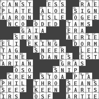 ACROSS 1. 2nd pers. sing. pres. of can (arch.) 6. Double-curved letter 9. Actress Charlotte 12. Food holder 13. _ vera 14. Omen 15. Composer Copland 16. Capri or Wight 17. Double curve, resembling the letter S 18. Non-commissioned officer (abbr.) 19. Wrote a lyric poem 20. Scottish caps 21. Greek goddess of the earth (variant) 23. Epoch 24. Stitched 25. Nest on high 28. Connecticut Ivy Leaguer 30. Supplementing with great effort 34. Dormintory (informal) 35. Label 36. Contemptuous expression 38. Flowery wreath 39. Prong on a fork 41. Natives or inhabitants of Denmark 43. Eastern Standard Time (abbr.) 44. Believer in; advocate of (suffix) 46. Pate de foie ____ 48. Bear (Spanish) 49. Sever or remove by pinching or nipping 50. Group working together 51. Portico 53. Parent Teacher Assoc. 56. Silvers or Donahue 57. Through, poetically 58. Actors Connery and Penn 60. Observes 61. Peachy ____! 62. Actors' quests 63. Big collection agency 64. Order of Saint Francis (abbr.) 65. Nick name for Arthur DOWN 1. Tax preparer (abbr.) 2. ____ Jay Lerner 3. Drug cop 4. Moe Howard, for one 5. "___ Little Indians" 6. Otherwise 7. Exchanged or delivered for money 8. Observe 9. Frustrating wastes of time 10. Eras 11. Compass dir. 13. Opera by Verdi 14. Flew 19. Pig sounds 20. Beverage made from leaves 22. Deep reverence 24. Seigniories (variant) 26. Angers 27. Give off 28. Singer James 29. Den 31. Indiana (abbr.) 32. Teachers' org. 33. Commissioned mil. rank 37. Canadian anthropologist Darnell 40. Artist's stands 42. Indian title of respect (Mr.) 45. At this time 47. Seem 49. Within a short period 50. "Mermaids" star 51. "______ My Girl" (Turtles hit) 52. Not kosher 54. Small pie 55. Against 56. Air pressure measure (abbr.) 57. Ring climax 58. Health resort 59. Compass dir.