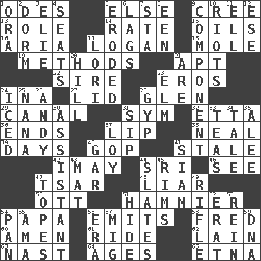 ACROSS 1. Lyric poems 5. Otherwise 9. Algonquian 13. Hero or heavy, e.g. 14. Assign a rank or rating to 15. Lubricates 16. Roberta Peters solo 17. Utah city north of Ogden 18. Undercover agent 19. Modes 21. Fitting 22. Title for a man of rank and authority 23. Greek god of love 24. _ tizzy (2 wds.) 27. Hat (slang) 28. Small, secluded valley 29. Lessep's creation 31. Symbol (abbr.) 32. Singer James 36. Extremities 37. Mouth edge 38. Actress Patricia 39. 24-hour periods 40. Grand Old Party 41. Showing deterioration from age 42. "If ____ say so..." 44. Indian title of respect (Mr.) 46. Observe 47. Russian ruler of old 48. One who doesn't tell the truth 50. Baseball player Mel 51. More overdramatic by comparison 54. Dad 56. Gives off 58. Flintstone 60. So be it 61. Travel on or in a vehicle 62. (Had) reclined 63. Political cartoonist Thomas 64. Eons 65. Inactive volcano in Sicily DOWN 1. Mouth or opening 2. Dormintory (informal) 3. Writer Wiesel 4. Theater features 5. Eaten away 6. Falls behind 7. R.R. building 8. Car or cant ending 9. Piece 10. Debaucheries 11. Pipe bend 12. Compass dir. 17. Australian parrot (variant) 20. Land elevation 21. "We ___ not amused" (Victoria) 23. Shade tree 24. On the rocks 25. Grandmother 26. Actor Griffith 28. Hustle 30. Aide 31. Small drink 33. Afternoon social gatherings 34. Lie 35. Toward shelter 37. Myrna of the movies 40. Slender fish 41. Thailand, formerly 43. Floor covering 44. Chalkboards 45. Basketball hoops 47. Drinks excessively 49. Firearm 51. Flintstone garb 52. Part of Q.E.F. 53. It's straight from the horse's mouth 54. Baking dish 55. Nanny (var.) 56. Period 57. Russian fighter aircraft 59. Heredity factor (abbr.)