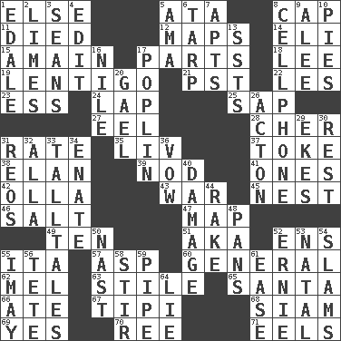 ACROSS 1. Otherwise 5. "One Day ___ Time" 8. Head covering 11. Passed on 12. Atlas contents 14. Connecticut Ivy Leaguer 15. At full speed 17. Components 18. Area sheltered from the wind 19. Small, flat, pigmented spot on the skin 21. Pacific Standard Time (abbr.) 22. French article 23. Double-curved letter 24. Infant locale 25. Plant excrement 27. Snakelike fish 28. "Mermaids" star 31. Pace 35. 54 in ancient Rome 37. Casino tip 38. Style 39. Allow head to fall sleepily 41. Washington bills 42. Spanish pot 43. Armed conflict 45. Egg locale 46. Table seasoning 47. Atlas unit 49. Nine, plus one 51. Alias (abbr.) 52. Followers of ems 55. Call ___ day 57. Viper 60. Commissioned military rank 62. Cartoonist voice _ Blanc 63. Vertical member of a panel or frame 65. Before Barbara or Clara 66. Had dinner 67. Native american tent (variation) 68. Thailand, formerly 69. Affirmative reply 70. To separate or throw off 71. Snakelike fish DOWN 1. Peak District village in England 2. Citrus fruits 3. Seines 4. Prepare for publication 5. Wet nurse (var.) 6. Canvas cover 7. Tenement units (abbr.) 8. Portable communications device 9. Toward shelter 10. Sliced desserts 13. Fast planes 16. Mediterranean tributary 17. Cotton for raincoats, e.g. 20. Highlander 26. 13-14th century defensive garment 29. Supplements with great effort 30. Remainder 31. Vintage cars 32. Silent film actress Nazimova 33. Baron Munchausen's specialties 34. Maternal 36. Promise 40. Break 44. Libertine 48. Baking dishes 50. Political cartoonist Thomas 52. Bert's buddy 53. Relating to or accompanying birth 54. Criticizes harshly 55. "If ____ say so..." 56. Wig 58. Commotion 59. Corncob 61. Relaxation 64. Untruth
