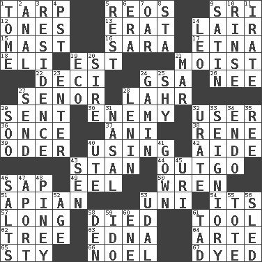 ACROSS 1. Canvas cover 5. Vintage cars 9. Indian title of respect (Mr.) 12. Washington bills 13. Part of Q.E.F. 14. Den 15. Vertical spar for supporting sails 16. "Two Mules for Sister ____" 17. Inactive volcano in Sicily 18. Biblical high priest 19. Eastern Standard Time (abbr.) 21. Wet 22. Tenth: prefix 24. Girls' org. (abbr.) 26. Born 27. Sir (Sp.) 28. Cowardly lion portrayer 29. Emitted 30. Foe 32. One who uses or employs something 36. Single time 37. Black tropical American cuckoo 38. French philosopher Descartes 39. Baltic tributary 40. Putting into practice 42. Helper 43. Comedian Laurel of Laurel & Hardy 44. Expenditure 46. Plant excrement 49. Snakelike fish 50. Songbird 51. Bee-related 53. Corn or form start 54. ___ a Wonderful Life 57. Yearn 58. Passed on 61. Implement 62. Woody plant 63. Pulitzer Prize-winning author Ferber 64. Johnson of "Laugh-In" 65. Filthy place 66. Christmas carol 67. Colored DOWN 1. Heavy book 2. Of or related to the anus 3. Dwelling 4. Pacific Standard Time (abbr.) 5. Respite 6. Epoch 7. Boat paddle 8. R.R. building 9. Smooth fabric 10. Remove soap 11. Feeling or showing extreme anger 14. Lion 19. Environmental prefix 20. The founder of a family 21. Make imperfect 23. Keyboard key 24. Street urchin 25. Like a shrinking violet 27. Post 28. Soviet premier 1918-24 29. "Barney Miller" actor Jack 31. Rhinal 32. A salt of uric acid 33. Signiory (variant) 34. Inside; within (prefix) 35. To riddle 40. Shoshoni 41. Woman's formal wear 43. Elected rep. 45. RI univ. 46. Table seasonings 47. To the left, to Queeg 48. Abounding in pines 52. Grow older 53. Freehold land 55. Lug 56. Downhill vehicle 58. Lair 59. Wedding promise 60. Compass dir. 61. Small amount or degree