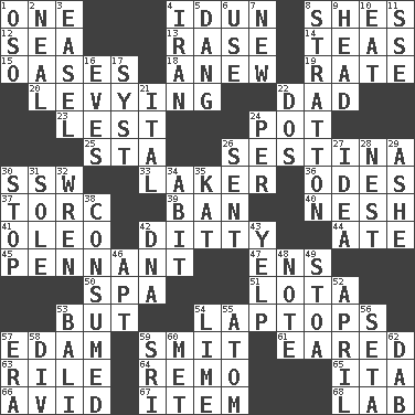 ACROSS 1. Single 4. Goddess of spring and wife of Bragi 8. "______ My Girl" (Turtles hit) 12. Ocean 13. To erase 14. Beverages made from leaves 15. Fertile tracts in a desert 18. Afresh 19. Assign a rank or rating to 20. Imposing or collecting, as a tax 22. Male parent 23. For fear that 24. Cooking vessel 25. R.R. building 26. French poetic form 30. Compass dir. 33. Member of a famous L.A. basketball team 36. Lyric poems 37. Torque (variant) 39. Forbid 40. Delicate 41. Butter sub 42. Short, simple song 44. Had dinner 45. Pre-World Series prize 47. Followers of ems 50. Health resort 51. Globular water bottle used in Asia 53. Yet 54. Portable computers 57. Dutch treat 59. Stricken, poetically 61. Having ears or earlike features 63. Cause heat under the collar 64. San ____ (Riviera town) 65. Call ___ day 66. Enthusiastic 67. A distinct part 68. Experiment locale DOWN 1. Bear (Spanish) 2. Be tempered by heat 3. Artist's stand 4. SW Asia republic 5. Mild oath, euphamism for damn 6. Purpose 7. ___ Haven, CT 8. Ski resort town in Vermont 9. Froth on beer 10. Consume 11. Compass dir. 16. Nights before holidays 17. System (abbr.) 21. Slanted text style (abbr.) 22. Two (Sp.) 24. For each 26. Posted 27. The main thing one is thinking about 28. A home for chicks 29. American tennis player Robert 30. Close up, plug up 31. Not divided or shared with others 32. Songbird 34. "This won't hurt ____!" 35. Krazy ___ of comics 38. Ingested 42. Heredity factor (abbr.) 43. Sharp bark 46. Fitting 48. Observe 49. Portico 52. Showery time 53. Indonesian resort city 54. Welles in "The Third Man" 55. Smallest unit of an element 56. Stalk of a moss capsule 57. Period 58. HTML Container Element 59. Indian title of respect (Mr.) 60. Was introduced to 62. Apply (a substance) by light strokes