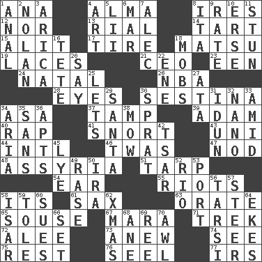 ACROSS 1. Santa ___, CA 4. _ mater 8. Angers 12. Not either 13. Monetary unit of Yemen 14. Small pie 15. Came down and settled, as after flight 17. Become fatigued 18. Taiwanese island in East China Sea 19. Shoestrings 21. Corporate head (abbr.) 23. Car or cant ending 24. Relating to or accompanying birth 26. Basketball assoc. 28. Sight organs 30. French poetic form 34. White ___ sheet 37. Pack (down) 39. First man 40. Hit sharply and swiftly 41. Derisive sound 43. University (slang) 44. International (abbr.) 46. It was, poetically 47. Allow head to fall sleepily 48. Nineveh was its capital 51. Canvas cover 54. Hearing organ 55. Debaucheries 58. ___ a Wonderful Life 61. Saxophone 63. Declaim 65. Boozer 67. Hindu Mythology: god of death 71. Long journey 72. Toward shelter 73. Afresh 74. Perceive with the eye 75. State of inaction 76. Sew up the eyelids of hawks and falcons 77. Big collection agency DOWN 1. Of or related to the anus 2. Pitcher Ryan 3. N. Chile seaport 4. Nonscientific branch of learning 5. Cards in a Roman deck? 6. Impair 7. Actor Baldwin 8. Call ___ day 9. Pace 10. Celtic language 11. Astound 16. Wig 18. Crowds into 20. Declare 22. Compass dir. 25. Allows 27. _ moment's notice (2 wds.) 29. Before Barbara or Clara 30. Small fatty European fish 31. Goddess of spring and wife of Bragi 32. Billionth: prefix 33. Among 34. Roberta Peters solo 35. Without 36. Tenement units (abbr.) 38. Cut the grass 42. Russian ruler of old 45. Potassium hydroxide 49. Raze (variant) 50. Retirement account (abbr.) 52. _ de Janeiro 53. Sweet dark-red dessert wine 56. Tarsus (plural) 57. Bull 58. Austrian river, tributary to the Danube 59. Lacquered or enameled metalware 60. Institutes legal proceedings 62. Dec. holiday 64. Makes supply last 66. Arrange properly for use 68. One (Scot) 69. Portuguese money of account (variant) 70. Leather borer
